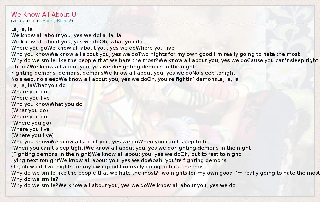 La, la, la We know all about you, yes we doLa, la, la We know all about you, yes we doOh, what you do Where you goWe know all about you, yes we doWhere you live Who you knowWe know all about you, yes we doTwo nights for my own good I'm really going to hate the most Why do we smile like the people that we hate the most?We know all about you, yes we doCause you can't sleep tight Uh-ho?We know all about you, yes we doFighting demons in the night Fighting demons, demons, demonsWe know all about you, yes we doNo sleep tonight No sleep, no sleepWe know all about you, yes we doOh, you're fightin' demonsLa, la, la La, la, laWhat you do Where you go Where you live Who you knowWhat you do (What you do) Where you go (Where you go) Where you live (Where you live) Who you knowWe know all about you, yes we doWhen you can't sleep tight (When you can't sleep tight)We know all about you, yes we doFighting demons in the night (Fighting demons in the night)We know all about you, yes we doOh, put to rest to night Lying next tonightWe know all about you, yes we doWoah, you're fighting demons Oh, oh woahTwo nights for my own good I'm really going to hate the most Why do we smile like the people that we hate the most?Two nights for my own good I'm really going to hate the most Why do we smile? Why do we smile?We know all about you, yes we doWe know all about you, yes we do