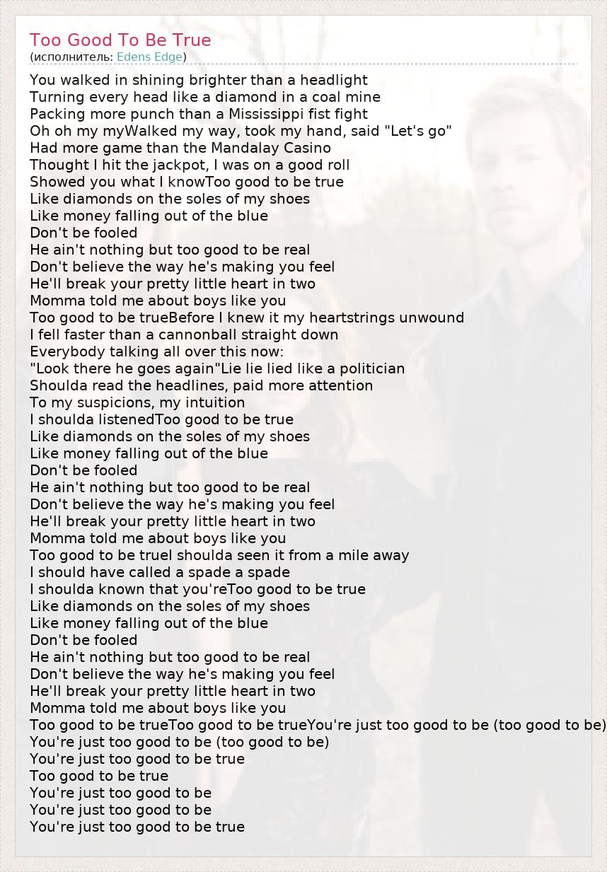 You walked in shining brighter than a headlight Turning every head like a diamond in a coal mine Packing more punch than a Mississippi fist fight Oh oh my myWalked my way, took my hand, said "Let's go" Had more game than the Mandalay Casino Thought I hit the jackpot, I was on a good roll Showed you what I knowToo good to be true Like diamonds on the soles of my shoes Like money falling out of the blue Don't be fooled He ain't nothing but too good to be real Don't believe the way he's making you feel He'll break your pretty little heart in two Momma told me about boys like you Too good to be trueBefore I knew it my heartstrings unwound I fell faster than a cannonball straight down Everybody talking all over this now: "Look there he goes again"Lie lie lied like a politician Shoulda read the headlines, paid more attention To my suspicions, my intuition I shoulda listenedToo good to be true Like diamonds on the soles of my shoes Like money falling out of the blue Don't be fooled He ain't nothing but too good to be real Don't believe the way he's making you feel He'll break your pretty little heart in two Momma told me about boys like you Too good to be trueI shoulda seen it from a mile away I should have called a spade a spade I shoulda known that you'reToo good to be true Like diamonds on the soles of my shoes Like money falling out of the blue Don't be fooled He ain't nothing but too good to be real Don't believe the way he's making you feel He'll break your pretty little heart in two Momma told me about boys like you Too good to be trueToo good to be trueYou're just too good to be (too good to be) You're just too good to be (too good to be) You're just too good to be true Too good to be true You're just too good to be You're just too good to be You're just too good to be true