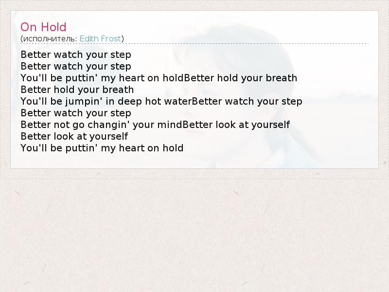 Better watch your step Better watch your step You'll be puttin' my heart on holdBetter hold your breath Better hold your breath You'll be jumpin' in deep hot waterBetter watch your step Better watch your step Better not go changin' your mindBetter look at yourself Better look at yourself You'll be puttin' my heart on hold