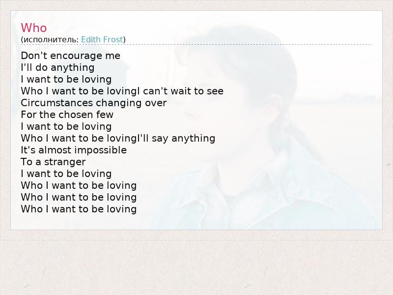 Это интересно:Эдит Фрост (род. 18 августа 1964 года), американская певица и автор песен. Определяет свой музыкальный стиль как "задумчивая деревенская психоделия".В период с 1997 по 2005 гг. записала 4 пластинки на лэйбле Drag City: альбом 1998 года продюсировал Нил Хагерти (экс-Pussy Galore, Royal Trux), а 2001 - Стив Альбини.
