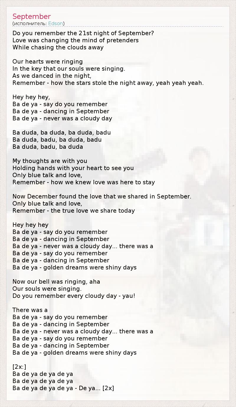 Ты помнишь 21-ую ночь сентября? Тогда любовь преобразила взгляды двух притворщиков, Разогнав покров тьмы. Наши сердца звенели В том же ключе, в котором пели наши души. Пока мы танцевали в ночи, Помнишь, как ярко её осветили звёзды? 1 Да, да, да! Эй, эй, эй Ба-ду-а - скажи, ты помнишь... Ба-ду-а - танец в сентябре? Ба-ду-а - в тот день не было ни облачка. Ба-дуда, ба-дуда, ба-дуда, баду Ба-дуда, баду, ба-дуда, баду Ба-дуда, баду, ба-дуба Мои мысли с тобой, Прикасаюсь к твоей душе, 2 чтобы увидеть тебя. Лишь непристойные разговоры и любовь... Помнишь, как нам стало ясно, что эта любовь навсегда? Теперь декабрь познал любовь, которую мы разделили в сентябре. Лишь непристойные разговоры и любовь... Помни: настоящая любовь - та, что мы испытываем сейчас. Эй, эй, эй Ба-ду-а - скажи, ты помнишь... Ба-ду-а - танец в сентябре? Ба-ду-а - в тот день не было ни облачка. Было... Ба-ду-а - скажи, ты помнишь... Ба-ду-а - танец в сентябре? Ба-ду-а - голубой мечтой были те солнечные дни. Теперь звонил наш колокольчик, ага, Наши души пели. Ты помнишь каждый облачный день? Да! Было... Ба-ду-а - скажи, ты помнишь... Ба-ду-а - танец в сентябре? Ба-ду-а - в тот день не было ни облачка. Было... Ба-ду-а - скажи, ты помнишь... Ба-ду-а - танец в сентябре? Ба-ду-а - голубой мечтой были те солнечные дни. [2x:] Ба-ду-а, ду-а, ду-а. Ба-ду-а, ду-а, ду-а. Ба-ду-а, ду-а, ду-а... 1 - буквально: Помнишь, как звёзды её [ночь] украли? 2 - буквально: пожимаю руки твоей душе/сердцу 3 - фразеологизм: ring the/one's bell ~ приходить на память, казаться знакомым, напоминать