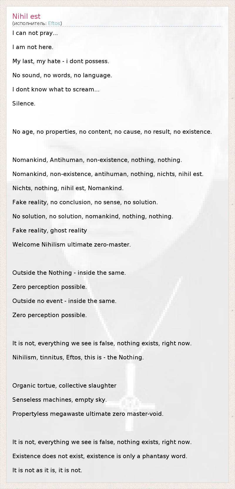 I can not pray... I am not here. My last, my hate - i dont possess. No sound, no words, no language. I dont know what to scream... Silence. No age, no properties, no content, no cause, no result, no existence. Nomankind, Antihuman, non-existence, nothing, nothing. Nomankind, non-existence, antihuman, nothing, nichts, nihil est. Nichts, nothing, nihil est, Nomankind. Fake reality, no conclusion, no sense, no solution. No solution, no solution, nomankind, nothing, nothing. Fake reality, ghost reality Welcome Nihilism ultimate zero-master. Outside the Nothing - inside the same. Zero perception possible. Outside no event - inside the same. Zero perception possible. It is not, everything we see is false, nothing exists, right now. Nihilism, tinnitus, Eftos, this is - the Nothing. Organic tortue, collective slaughter Senseless machines, empty sky. Propertyless megawaste ultimate zero master-void. It is not, everything we see is false, nothing exists, right now. Existence does not exist, existence is only a phantasy word. It is not as it is, it is not.