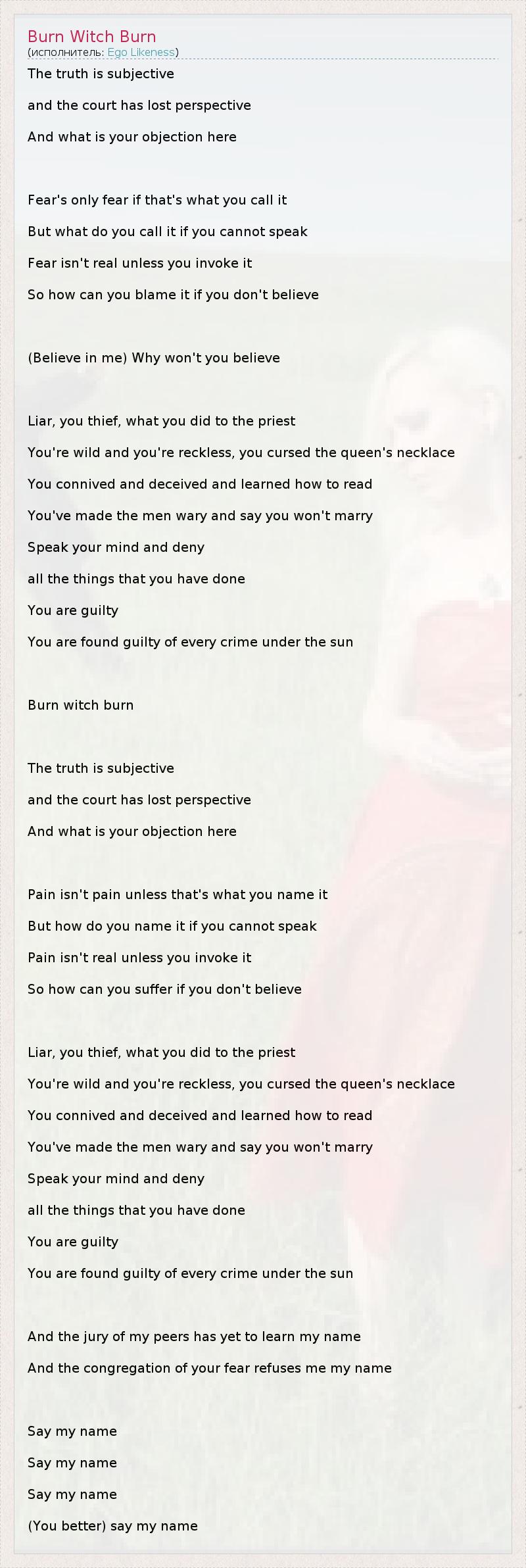 The truth is subjective and the court has lost perspective And what is your objection here Fear's only fear if that's what you call it But what do you call it if you cannot speak Fear isn't real unless you invoke it So how can you blame it if you don't believe (Believe in me) Why won't you believe Liar, you thief, what you did to the priest You're wild and you're reckless, you cursed the queen's necklace You connived and deceived and learned how to read You've made the men wary and say you won't marry Speak your mind and deny all the things that you have done You are guilty You are found guilty of every crime under the sun Burn witch burn The truth is subjective and the court has lost perspective And what is your objection here Pain isn't pain unless that's what you name it But how do you name it if you cannot speak Pain isn't real unless you invoke it So how can you suffer if you don't believe Liar, you thief, what you did to the priest You're wild and you're reckless, you cursed the queen's necklace You connived and deceived and learned how to read You've made the men wary and say you won't marry Speak your mind and deny all the things that you have done You are guilty You are found guilty of every crime under the sun And the jury of my peers has yet to learn my name And the congregation of your fear refuses me my name Say my name Say my name Say my name (You better) say my name