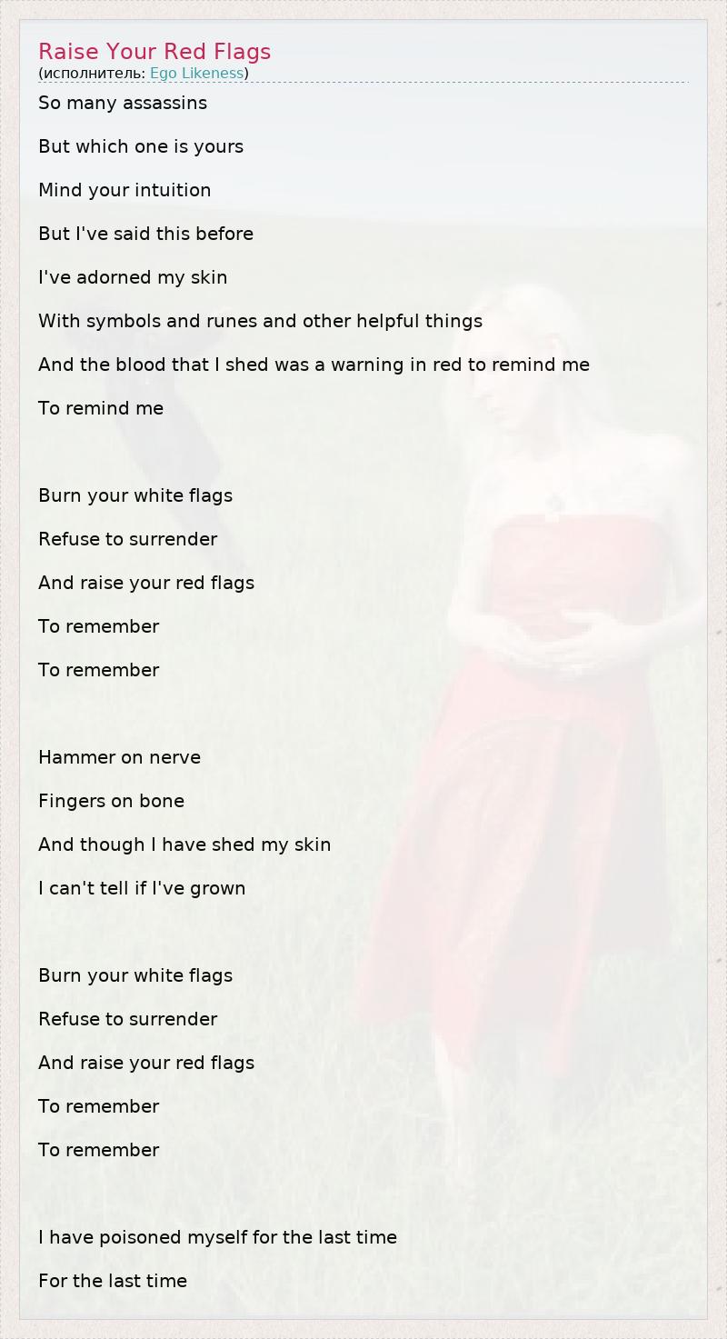So many assassins But which one is yours Mind your intuition But I've said this before I've adorned my skin With symbols and runes and other helpful things And the blood that I shed was a warning in red to remind me To remind me Burn your white flags Refuse to surrender And raise your red flags To remember To remember Hammer on nerve Fingers on bone And though I have shed my skin I can't tell if I've grown Burn your white flags Refuse to surrender And raise your red flags To remember To remember I have poisoned myself for the last time For the last time