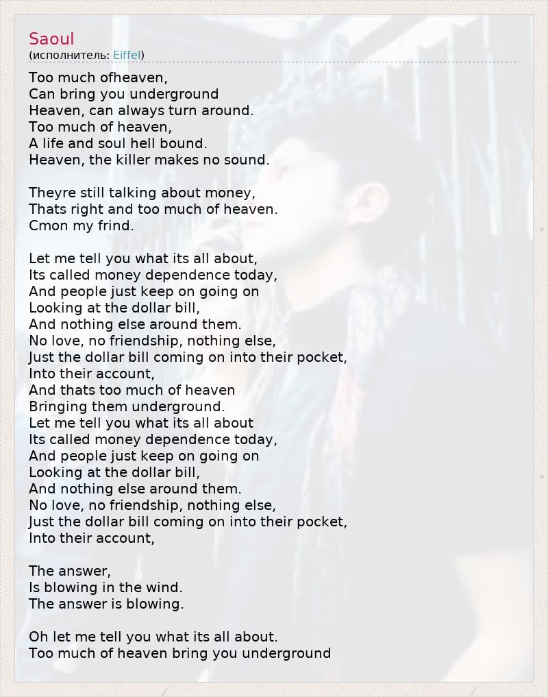 Too much ofheaven, Can bring you underground Heaven, can always turn around. Too much of heaven, A life and soul hell bound. Heaven, the killer makes no sound. Theyre still talking about money, Thats right and too much of heaven. Cmon my frind. Let me tell you what its all about, Its called money dependence today, And people just keep on going on Looking at the dollar bill, And nothing else around them. No love, no friendship, nothing else, Just the dollar bill coming on into their pocket, Into their account, And thats too much of heaven Bringing them underground. Let me tell you what its all about Its called money dependence today, And people just keep on going on Looking at the dollar bill, And nothing else around them. No love, no friendship, nothing else, Just the dollar bill coming on into their pocket, Into their account, The answer, Is blowing in the wind. The answer is blowing. Oh let me tell you what its all about. Too much of heaven bring you underground