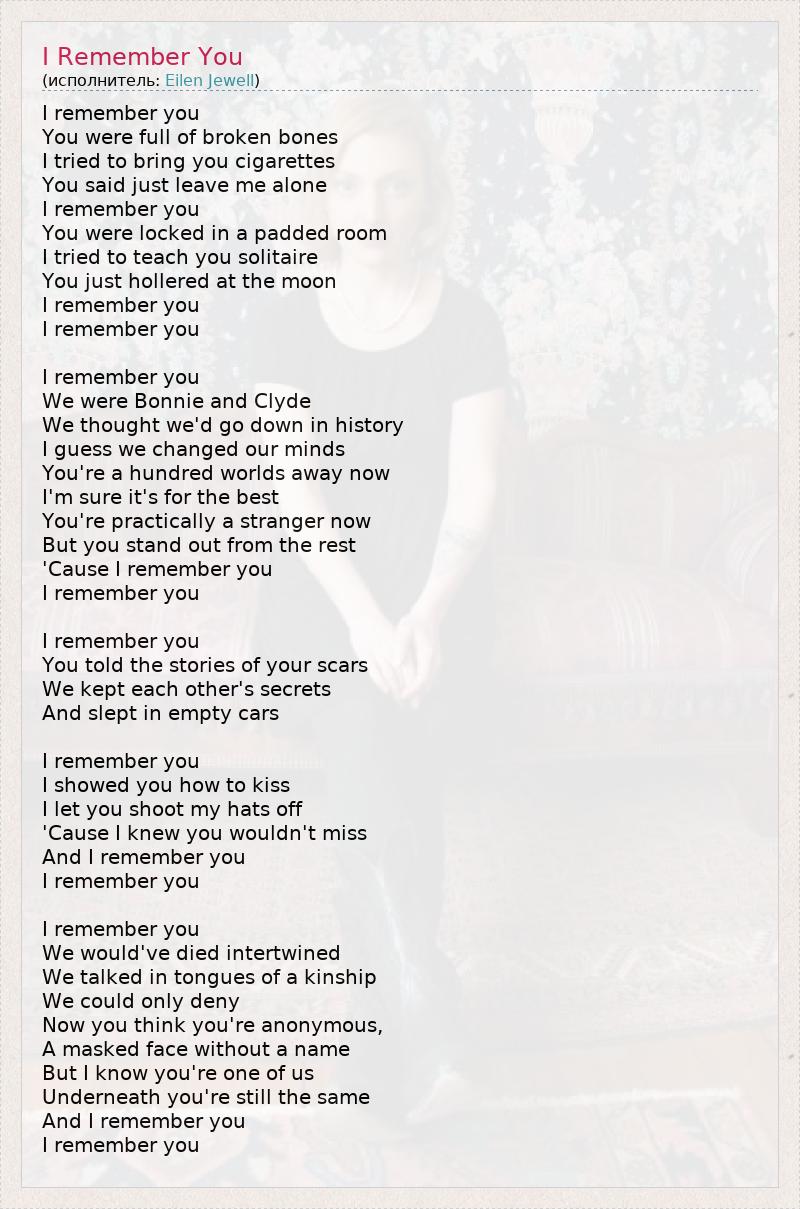 Я тебя помню Вы были полны сломанных костей Я пытался принести вам сигареты Вы сказали, что просто оставить меня в покое Я тебя помню Вы были заблокированы в мягкой комнате Я пытался научить тебя пасьянс Вы просто кричал на луну Я тебя помню Я тебя помню Я тебя помню Мы были Бонни и Клайд Мы думали, что войдет в историю Я думаю, что мы изменили наши умы Вы сотен миров прочь сейчас Я уверен, что это к лучшему Ты практически незнакомец сейчас Но вам выделиться из остальной Потому что я тебя помню Я тебя помню Я тебя помню Вы сказали истории ваших шрамов Мы все секреты друг друга И спал в порожних вагонов Я тебя помню Я показал вам, как поцеловать Я позволю вам снимать моих шляпы Потому что я знал, что ты бы не пропустить И я тебя помню Я тебя помню Я тебя помню Мы бы умер переплетены Мы говорили на языках одного родства Мы могли только отказать Теперь вы думаете, что вы неизвестным, Маске лицо без имени Но я знаю, что ты один из нас Под вы все еще то же самое И я тебя помню Я тебя помню