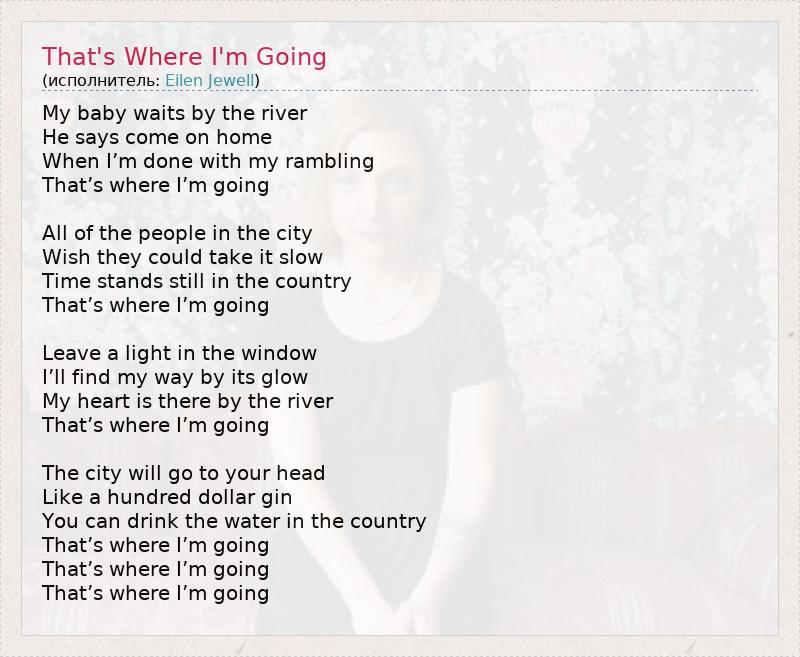 My baby waits by the river He says come on home When I’m done with my rambling That’s where I’m going All of the people in the city Wish they could take it slow Time stands still in the country That’s where I’m going Leave a light in the window I’ll find my way by its glow My heart is there by the river That’s where I’m going The city will go to your head Like a hundred dollar gin You can drink the water in the country That’s where I’m going That’s where I’m going That’s where I’m going