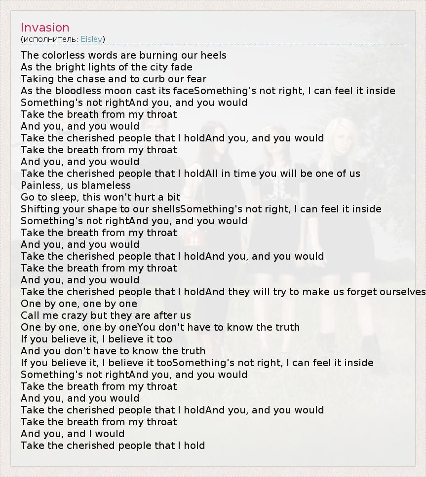 The colorless words are burning our heels As the bright lights of the city fade Taking the chase and to curb our fear As the bloodless moon cast its faceSomething's not right, I can feel it inside Something's not rightAnd you, and you would Take the breath from my throat And you, and you would Take the cherished people that I holdAnd you, and you would Take the breath from my throat And you, and you would Take the cherished people that I holdAll in time you will be one of us Painless, us blameless Go to sleep, this won't hurt a bit Shifting your shape to our shellsSomething's not right, I can feel it inside Something's not rightAnd you, and you would Take the breath from my throat And you, and you would Take the cherished people that I holdAnd you, and you would Take the breath from my throat And you, and you would Take the cherished people that I holdAnd they will try to make us forget ourselves One by one, one by one Call me crazy but they are after us One by one, one by oneYou don't have to know the truth If you believe it, I believe it too And you don't have to know the truth If you believe it, I believe it tooSomething's not right, I can feel it inside Something's not rightAnd you, and you would Take the breath from my throat And you, and you would Take the cherished people that I holdAnd you, and you would Take the breath from my throat And you, and I would Take the cherished people that I hold