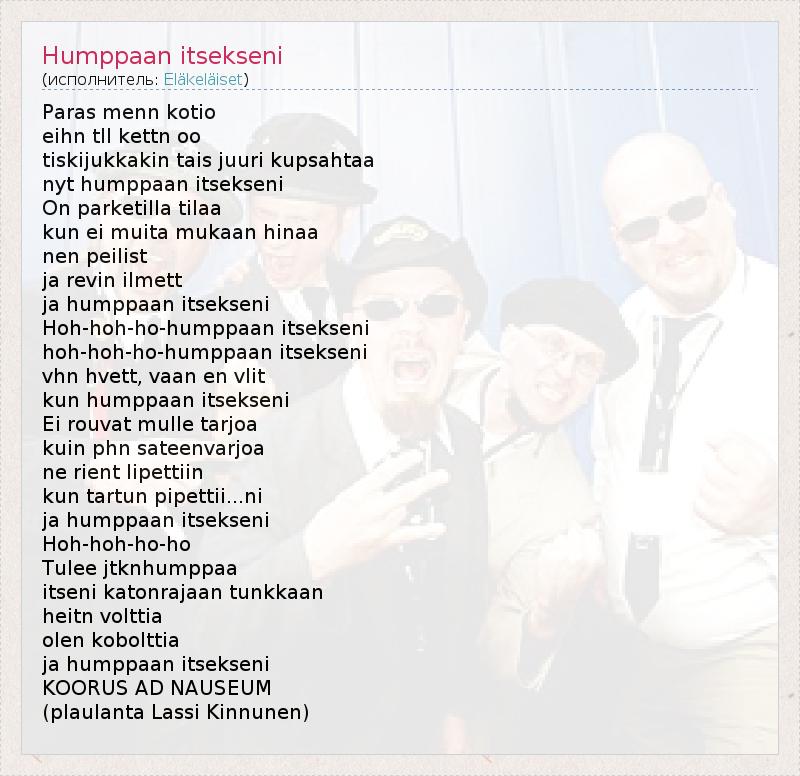 Paras menn kotio eihn tll kettn oo tiskijukkakin tais juuri kupsahtaa nyt humppaan itsekseni On parketilla tilaa kun ei muita mukaan hinaa nen peilist ja revin ilmett ja humppaan itsekseni Hoh-hoh-ho-humppaan itsekseni hoh-hoh-ho-humppaan itsekseni vhn hvett, vaan en vlit kun humppaan itsekseni Ei rouvat mulle tarjoa kuin phn sateenvarjoa ne rient lipettiin kun tartun pipettii...ni ja humppaan itsekseni Hoh-hoh-ho-ho Tulee jtknhumppaa itseni katonrajaan tunkkaan heitn volttia olen kobolttia ja humppaan itsekseni KOORUS AD NAUSEUM (plaulanta Lassi Kinnunen)