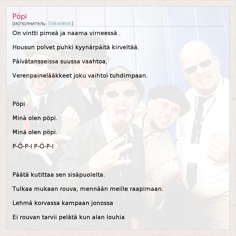 On vintti pimeä ja naama virneessä . Housun polvet puhki kyynärpäitä kirveltää. Päivätansseissa suussa vaahtoa, Verenpainelääkkeet joku vaihtoi tuhdimpaan. Pöpi Minä olen pöpi. Minä olen pöpi. P-Ö-P-I P-Ö-P-I Päätä kutittaa sen sisäpuolelta. Tulkaa mukaan rouva, mennään meille raapimaan. Lehmä korvassa kampaan jonossa Ei rouvan tarvii pelätä kun alan louhia
