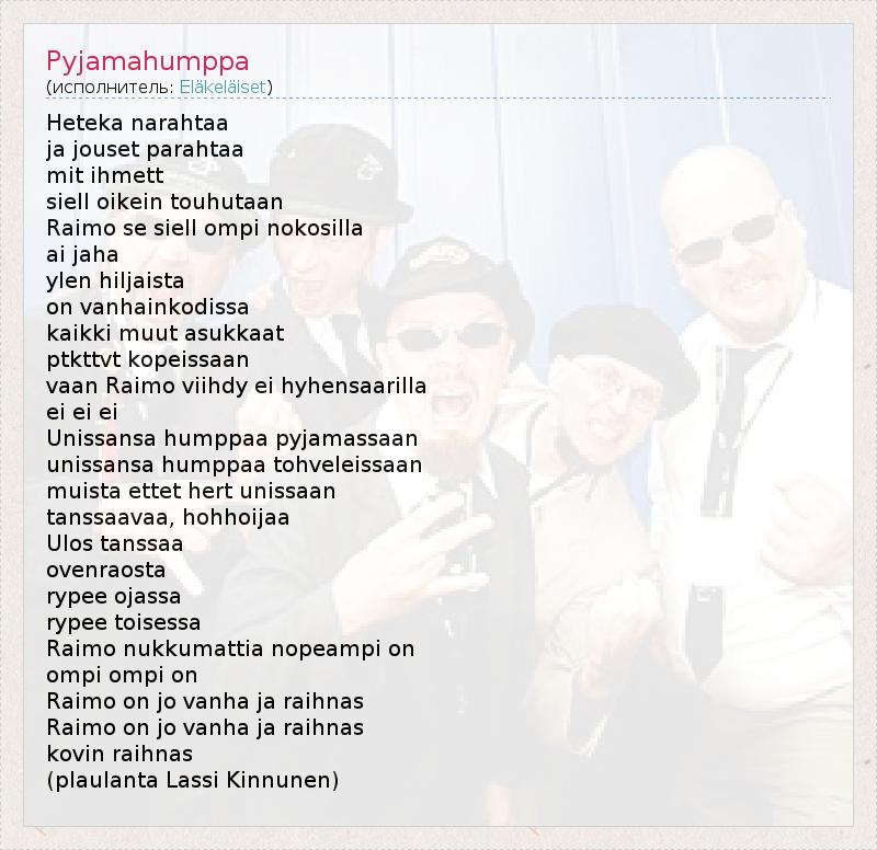 Это интересно:Eläkeläiset (фин. «Пенсионеры») — финский ансамбль, играющий музыку в стиле хумппа (финская разновидность быстрого фокстрота), преимущественно кавер-версии известных рок- и поп-хитов. Образовался в 1993 году. На протяжении существования ансамбля его состав претерпевал некоторые изменения, но наиболее постоянными участниками являются Онни Варис (клавишные, вокал), Матти Варис (бас-гитара,... продолжение