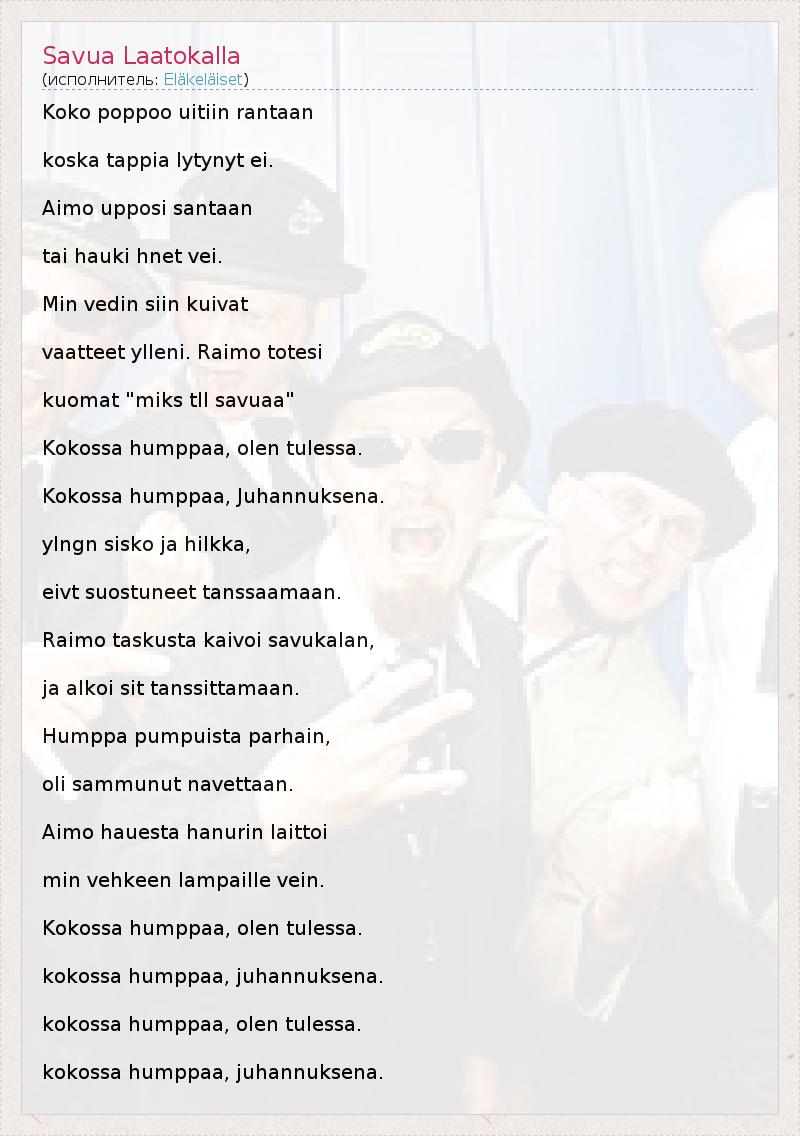 Koko poppoo uitiin rantaan koska tappia lytynyt ei. Aimo upposi santaan tai hauki hnet vei. Min vedin siin kuivat vaatteet ylleni. Raimo totesi kuomat "miks tll savuaa" Kokossa humppaa, olen tulessa. Kokossa humppaa, Juhannuksena. ylngn sisko ja hilkka, eivt suostuneet tanssaamaan. Raimo taskusta kaivoi savukalan, ja alkoi sit tanssittamaan. Humppa pumpuista parhain, oli sammunut navettaan. Aimo hauesta hanurin laittoi min vehkeen lampaille vein. Kokossa humppaa, olen tulessa. kokossa humppaa, juhannuksena. kokossa humppaa, olen tulessa. kokossa humppaa, juhannuksena.