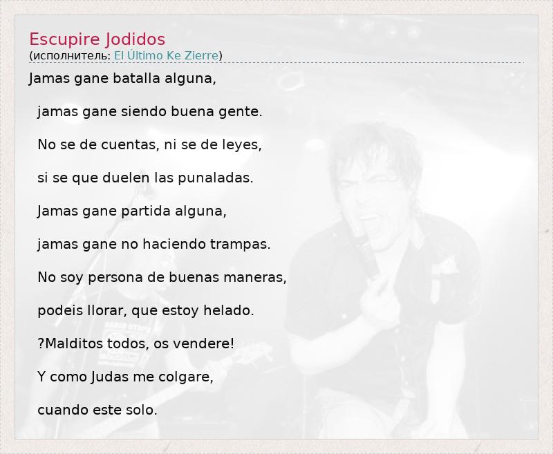 Jamas gane batalla alguna, jamas gane siendo buena gente. No se de cuentas, ni se de leyes, si se que duelen las punaladas. Jamas gane partida alguna, jamas gane no haciendo trampas. No soy persona de buenas maneras, podeis llorar, que estoy helado. ?Malditos todos, os vendere! Y como Judas me colgare, cuando este solo.