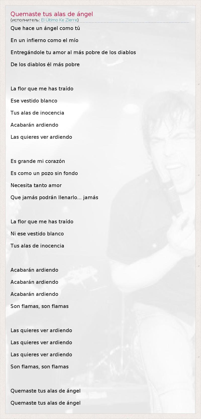 Que hace un ángel como tú En un infierno como el mío Entregándole tu amor al más pobre de los diablos De los diablos él más pobre La flor que me has traído Ese vestido blanco Tus alas de inocencia Acabarán ardiendo Las quieres ver ardiendo Es grande mi corazón Es como un pozo sin fondo Necesita tanto amor Que jamás podrán llenarlo... jamás La flor que me has traído Ni ese vestido blanco Tus alas de inocencia Acabarán ardiendo Acabarán ardiendo Acabarán ardiendo Son flamas, son flamas Las quieres ver ardiendo Las quieres ver ardiendo Las quieres ver ardiendo Son flamas, son flamas Quemaste tus alas de ángel Quemaste tus alas de ángel