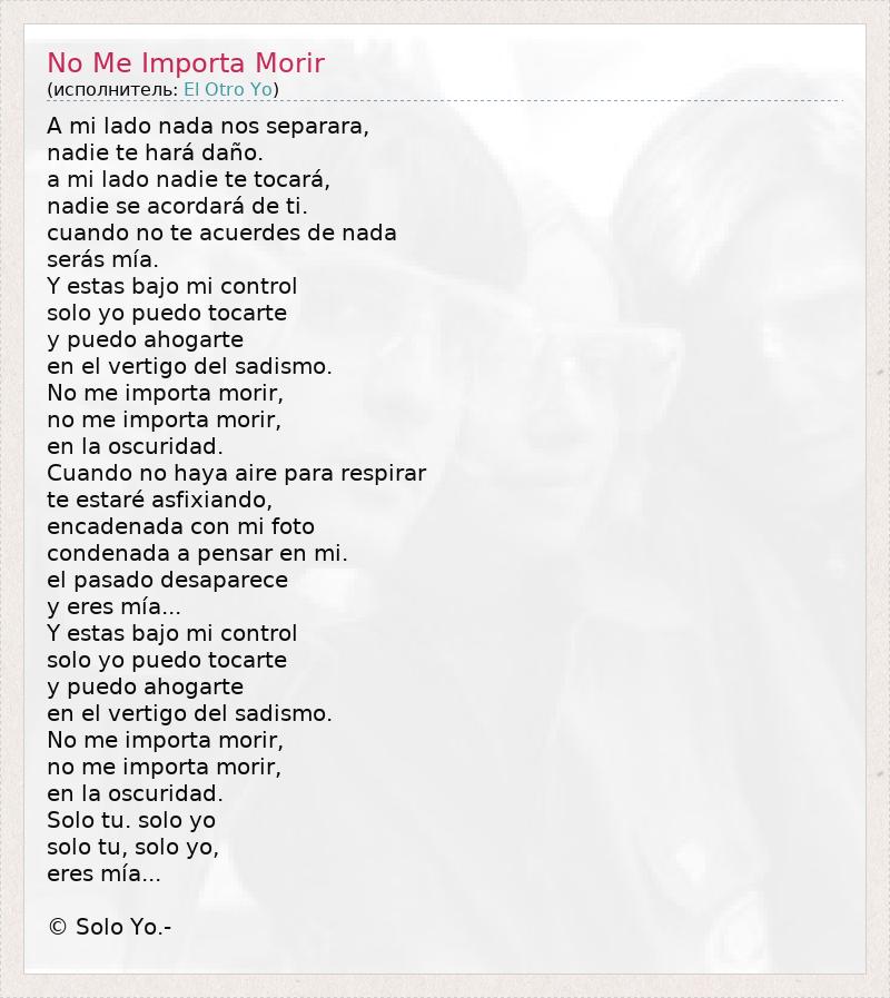 Ми Ладо нада ВОФК separara , Nadie те Хара Дано . миль Ладо Nadie те tocará , Nadie себе acordará де ти . Квандо не те acuerdes де нада Seras МВД. Контроль Y Estas Бахо миль соло лет puedo tocarte у puedo ahogarte ан -эль головокружение дель sadismo . Нет мне Importa Morir , нет меня Importa Morir , ан ла oscuridad . Не Квандо не хайа эром пункт respirar Те estaré asfixiando , encadenada кон миль фото condenadapensar ан миль . эль Pasado desaparece у ERES Mía ... Контроль Y Estas Бахо миль соло лет puedo tocarte у puedo ahogarte ан -эль головокружение дель sadismo . Нет мне Importa Morir , нет меня Importa Morir , ан ла oscuridad . Solo Tu . соло лет Solo Tu , соло лет , ERES Mía ... © Solo Йо . -