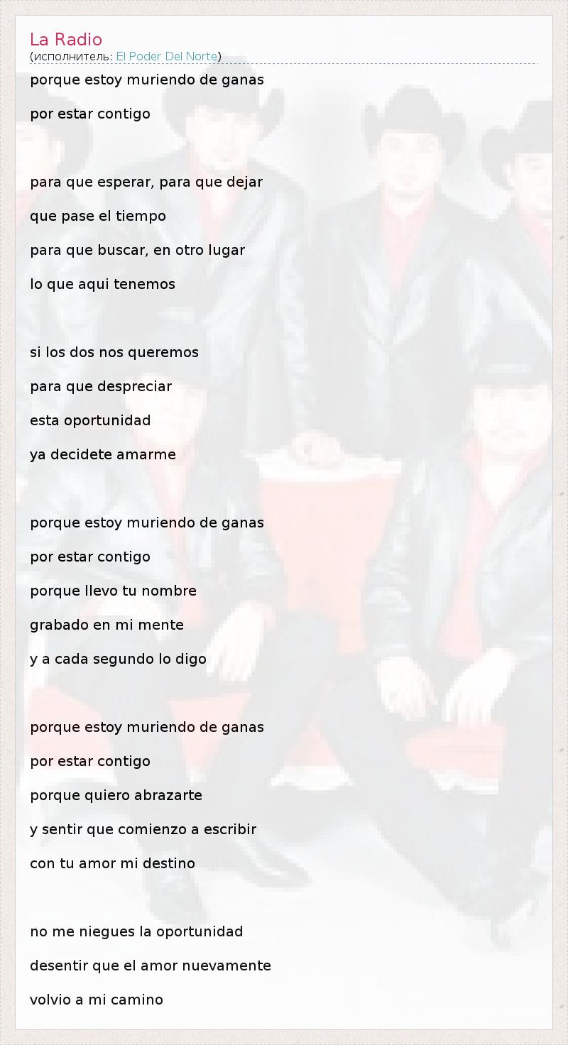 porque estoy muriendo de ganas por estar contigo para que esperar, para que dejar que pase el tiempo para que buscar, en otro lugar lo que aqui tenemos si los dos nos queremos para que despreciar esta oportunidad ya decidete amarme porque estoy muriendo de ganas por estar contigo porque llevo tu nombre grabado en mi mente y a cada segundo lo digo porque estoy muriendo de ganas por estar contigo porque quiero abrazarte y sentir que comienzo a escribir con tu amor mi destino no me niegues la oportunidad desentir que el amor nuevamente volvio a mi camino