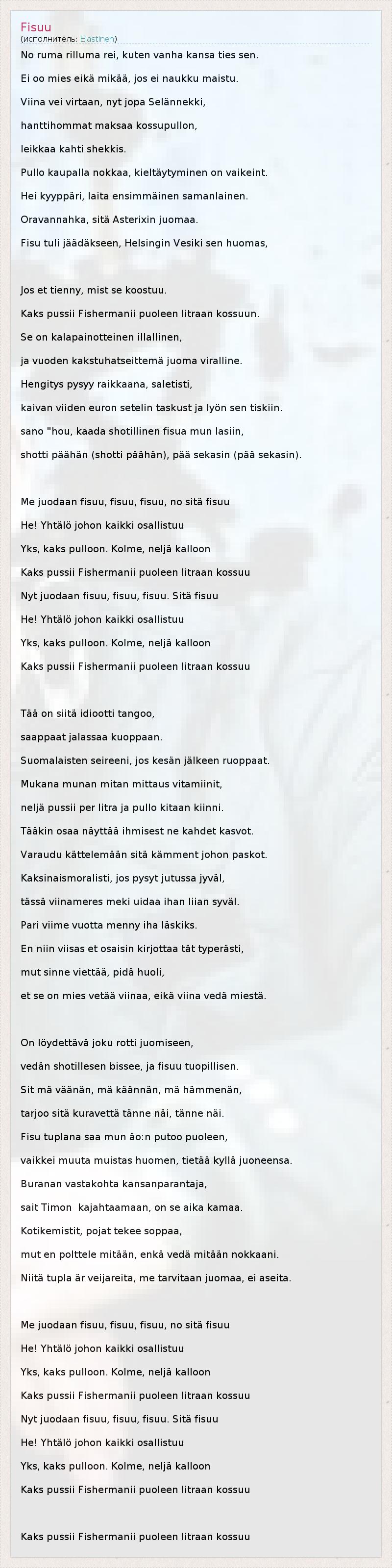 No ruma rilluma rei, kuten vanha kansa ties sen. Ei oo mies eikä mikää, jos ei naukku maistu. Viina vei virtaan, nyt jopa Selännekki, hanttihommat maksaa kossupullon, leikkaa kahti shekkis. Pullo kaupalla nokkaa, kieltäytyminen on vaikeint. Hei kyyppäri, laita ensimmäinen samanlainen. Oravannahka, sitä Asterixin juomaa. Fisu tuli jäädäkseen, Helsingin Vesiki sen huomas, Jos et tienny, mist se koostuu. Kaks pussii Fishermanii puoleen litraan kossuun. Se on kalapainotteinen illallinen, ja vuoden kakstuhatseittemä juoma viralline. Hengitys pysyy raikkaana, saletisti, kaivan viiden euron setelin taskust ja lyön sen tiskiin. sano "hou, kaada shotillinen fisua mun lasiin, shotti päähän (shotti päähän), pää sekasin (pää sekasin). Me juodaan fisuu, fisuu, fisuu, no sitä fisuu He! Yhtälö johon kaikki osallistuu Yks, kaks pulloon. Kolme, neljä kalloon Kaks pussii Fishermanii puoleen litraan kossuu Nyt juodaan fisuu, fisuu, fisuu. Sitä fisuu He! Yhtälö johon kaikki osallistuu Yks, kaks pulloon. Kolme, neljä kalloon Kaks pussii Fishermanii puoleen litraan kossuu Tää on siitä idiootti tangoo, saappaat jalassaa kuoppaan. Suomalaisten seireeni, jos kesän jälkeen ruoppaat. Mukana munan mitan mittaus vitamiinit, neljä pussii per litra ja pullo kitaan kiinni. Tääkin osaa näyttää ihmisest ne kahdet kasvot. Varaudu kättelemään sitä kämment johon paskot. Kaksinaismoralisti, jos pysyt jutussa jyväl, tässä viinameres meki uidaa ihan liian syväl. Pari viime vuotta menny iha läskiks. En niin viisas et osaisin kirjottaa tät typerästi, mut sinne viettää, pidä huoli, et se on mies vetää viinaa, eikä viina vedä miestä. On löydettävä joku rotti juomiseen, vedän shotillesen bissee, ja fisuu tuopillisen. Sit mä väänän, mä käännän, mä hämmenän, tarjoo sitä kuravettä tänne näi, tänne näi. Fisu tuplana saa mun äo:n putoo puoleen, vaikkei muuta muistas huomen, tietää kyllä juoneensa. Buranan vastakohta kansanparantaja, sait Timon kajahtaamaan, on se aika kamaa. Kotikemistit, pojat tekee soppaa, mut en polttele mitään, enkä vedä mitään nokkaani. Niitä tupla är veijareita, me tarvitaan juomaa, ei aseita. Me juodaan fisuu, fisuu, fisuu, no sitä fisuu He! Yhtälö johon kaikki osallistuu Yks, kaks pulloon. Kolme, neljä kalloon Kaks pussii Fishermanii puoleen litraan kossuu Nyt juodaan fisuu, fisuu, fisuu. Sitä fisuu He! Yhtälö johon kaikki osallistuu Yks, kaks pulloon. Kolme, neljä kalloon Kaks pussii Fishermanii puoleen litraan kossuu Kaks pussii Fishermanii puoleen litraan kossuu