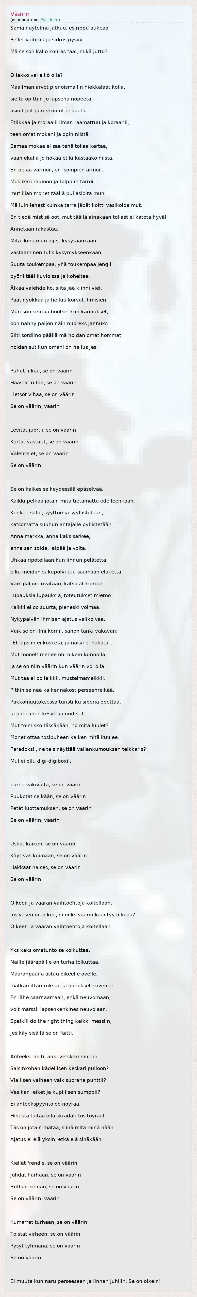 Sama näytelmä jatkuu, esirippu aukeaa Pellet vaihtuu ja sirkus pysyy Mä seison kallo kouras tääl, mikä juttu? Ollakko vai eikö olla? Maailman arvot pienoismallin hiekkalaatikolla, sieltä opittiin jo lapsena nopeeta asioit joit peruskoulut ei opeta. Etiikkaa ja moraalii ilman raamattuu ja koraanii, teen omat mokani ja opin niistä. Samaa mokaa ei saa tehä tokaa kertaa, vaan ekalla jo hokaa et kiikastaako niistä. En pelaa varmoil, en isompien armoil. Musiikkii radioon ja tolppiin tarroi, mut liian monet täällä pui asioita mun. Mä luin lehest kuinka tarra jäbät koitti vasikoida mut. En tiedä mist sä oot, mut täällä ainakaan tollast ei katota hyväl. Annetaan rakastaa. Mitä ikinä mun äijist kysytäänkään, vastaaminen tulis kysymykseenkään. Suuta soukempaa, yhä toukempaa jengii pyörii tääl kuvioissa ja koheltaa. Älkää valehdelko, siitä jää kiinni viel. Päät nyökkää ja heiluu korvat ihmisien. Mun suu seuraa bootsei kun kannukset, oon nähny paljon näin nuoreks jannuks. Silti sordiino päällä mä hoidan omat hommat, hoidan sut kun omani on hallus jes. Puhut liikaa, se on väärin Haastat riitaa, se on väärin Lietsot vihaa, se on väärin Se on väärin, väärin Levität juorui, se on väärin Kartat vastuut, se on väärin Valehtelet, se on väärin Se on väärin Se on kaikes selkeydessää epäselvää. Kaikki pelkää jotain mitä tietämättä edelleenkään. Kenkää sulle, syyttömiä syyllistetään, katsomatta suuhun antajalle pyllistetään. Anna markka, anna kaks särkee, anna sen soida, leipää ja voita. Uhkaa ripotellaan kun linnun pelätettä, eikä meidän sukupolvi tuu saamaan eläkettä. Vaik paljon luvataan, katsojat kieroon. Lupauksia lupauksia, toteutukset mietoo. Kaikki ei oo suurta, pieneski voimaa. Nykypäivän ihmisen ajatus valikoivaa. Vaik se on ilmi kornii, sanon tänki vakavan: "Et lapsiin ei kosketa, ja naisii ei hakata". Mut monelt menee ohi oikein kunnolla, ja se on niin väärin kun väärin voi olla. Mut tää ei oo leikkii, mustelmameikkii. Pitkin seinää kaikennäköst perseenreikää. Pakkomuutoksessa turisti ku siperia opettaa, ja pakkanen kesyttää nudistit. Mut toimisko tässäkään, no mitä luulet? Monet ottaa tosipuheen kaiken mitä kuulee. Paradoksii, ne tais näyttää vallankumouksen telkkaris? Mul ei ollu digi-digiboxii. Turha väkivalta, se on väärin Puukotat selkään, se on väärin Petät luottamuksen, se on väärin Se on väärin, väärin Uskot kaiken, se on väärin Käyt vasikoimaan, se on väärin Hakkaat naises, se on väärin Se on väärin Oikeen ja väärän vaihtoehtoja koitellaan. Jos vasen on oikea, ni onks väärin kääntyy oikeaa? Oikeen ja väärän vaihtoehtoja koitellaan. Yks kaks omatunto se kolkuttaa. Näille jääräpäille on turha tolkuttaa. Määränpäänä astuu oikeelle ovelle, matkamittari ruksuu ja panokset kovenee. En lähe saarnaamaan, enkä neuvomaan, voit marssii lapsenkenkines neuvolaan. Spaiklii do the right thing kaikki messiin, jes käy sisällä se on faitti. Anteeksi neiti, auki vetskari mul on. Saisinkohan kädellisen keskari pulloon? Viallisen valheen vaik suorana punttii? Vasikan leiket ja kupillisen sumppii? Ei anteekspyyntö oo nöyrää. Hidasta taitaa olla skradari tos töyrääl. Täs on jotain mätää, siinä mitä minä nään. Ajatus ei elä yksin, etkä elä sinäkään. Kiellät frendis, se on väärin Johdat harhaan, se on väärin Buffaat seinän, se on väärin Se on väärin, väärin Kumarrat turhaan, se on väärin Toistat virheen, se on väärin Pysyt tyhmänä, se on väärin Se on väärin Ei muuta kun naru perseeseen ja linnan juhliin. Se on oikein!
