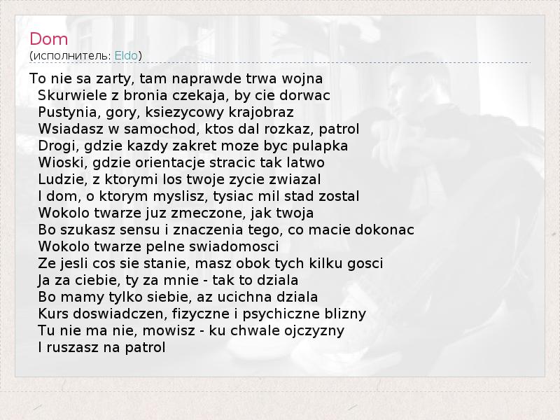 Это интересно:Eldo - от рождения Лешек Кажьмерчак (родился 27 июля 1979 года в Варшаве), также известный как Eldoka (псевдоним, полученных в результате интерпретации его инициалов L.K. (eL do Ka)) – польский рэпер и музыкант, участник уже не существующей реп группы Grammatik.Помимо всего прочего Лешек работал вместе с русским диджеем Вадимом, чешским дуэтом Indy & Wich и за «пределами» хип-хопа – с Лешкем Можджером и... продолжение
