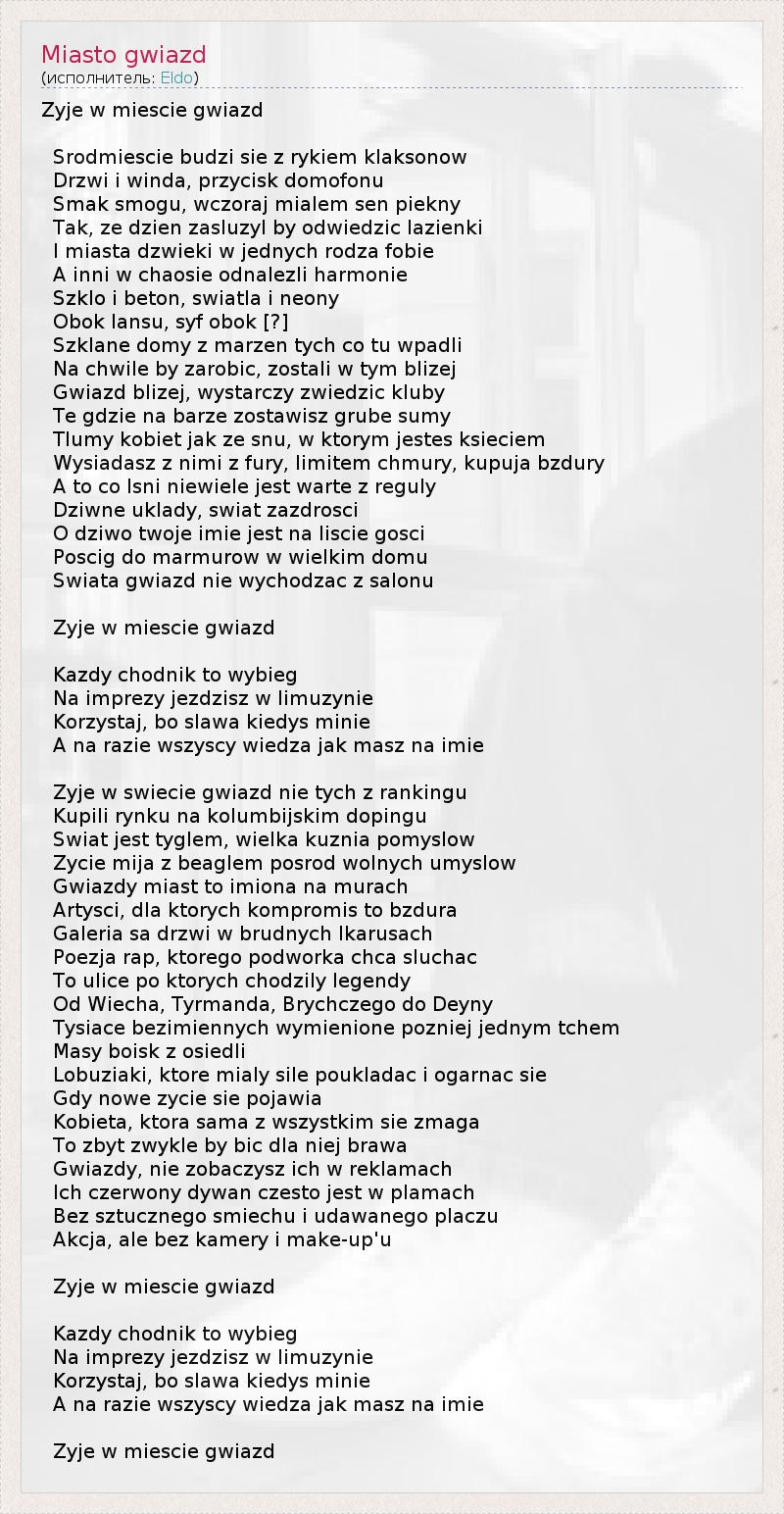 Zyje w miescie gwiazd Srodmiescie budzi sie z rykiem klaksonow Drzwi i winda, przycisk domofonu Smak smogu, wczoraj mialem sen piekny Tak, ze dzien zasluzyl by odwiedzic lazienki I miasta dzwieki w jednych rodza fobie A inni w chaosie odnalezli harmonie Szklo i beton, swiatla i neony Obok lansu, syf obok [?] Szklane domy z marzen tych co tu wpadli Na chwile by zarobic, zostali w tym blizej Gwiazd blizej, wystarczy zwiedzic kluby Te gdzie na barze zostawisz grube sumy Tlumy kobiet jak ze snu, w ktorym jestes ksieciem Wysiadasz z nimi z fury, limitem chmury, kupuja bzdury A to co lsni niewiele jest warte z reguly Dziwne uklady, swiat zazdrosci O dziwo twoje imie jest na liscie gosci Poscig do marmurow w wielkim domu Swiata gwiazd nie wychodzac z salonu Zyje w miescie gwiazd Kazdy chodnik to wybieg Na imprezy jezdzisz w limuzynie Korzystaj, bo slawa kiedys minie A na razie wszyscy wiedza jak masz na imie Zyje w swiecie gwiazd nie tych z rankingu Kupili rynku na kolumbijskim dopingu Swiat jest tyglem, wielka kuznia pomyslow Zycie mija z beaglem posrod wolnych umyslow Gwiazdy miast to imiona na murach Artysci, dla ktorych kompromis to bzdura Galeria sa drzwi w brudnych Ikarusach Poezja rap, ktorego podworka chca sluchac To ulice po ktorych chodzily legendy Od Wiecha, Tyrmanda, Brychczego do Deyny Tysiace bezimiennych wymienione pozniej jednym tchem Masy boisk z osiedli Lobuziaki, ktore mialy sile poukladac i ogarnac sie Gdy nowe zycie sie pojawia Kobieta, ktora sama z wszystkim sie zmaga To zbyt zwykle by bic dla niej brawa Gwiazdy, nie zobaczysz ich w reklamach Ich czerwony dywan czesto jest w plamach Bez sztucznego smiechu i udawanego placzu Akcja, ale bez kamery i make-up'u Zyje w miescie gwiazd Kazdy chodnik to wybieg Na imprezy jezdzisz w limuzynie Korzystaj, bo slawa kiedys minie A na razie wszyscy wiedza jak masz na imie Zyje w miescie gwiazd