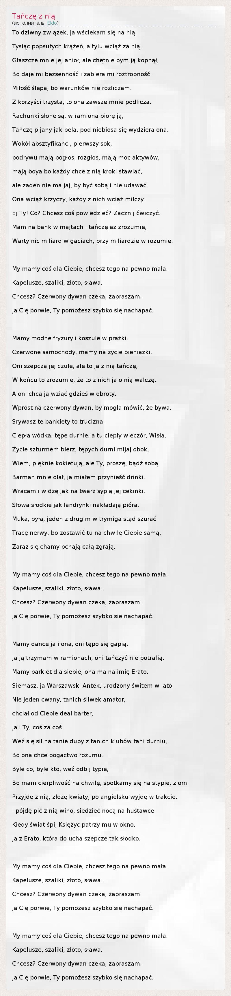 To dziwny związek, ja wściekam się na nią. Tysiąc popsutych krążeń, a tylu wciąż za nią. Głaszcze mnie jej anioł, ale chętnie bym ją kopnął, Bo daje mi bezsenność i zabiera mi roztropność. Miłość ślepa, bo warunków nie rozliczam. Z korzyści trzysta, to ona zawsze mnie podlicza. Rachunki słone są, w ramiona biorę ją, Tańczę pijany jak bela, pod niebiosa się wydziera ona. Wokół absztyfikanci, pierwszy sok, podrywu mają pogłos, rozgłos, mają moc aktywów, mają boya bo każdy chce z nią kroki stawiać, ale żaden nie ma jaj, by być sobą i nie udawać. Ona wciąż krzyczy, każdy z nich wciąż milczy. Ej Ty! Co? Chcesz coś powiedzieć? Zacznij ćwiczyć. Mam na bank w majtach i tańczę aż zrozumie, Warty nic miliard w gaciach, przy miliardzie w rozumie. My mamy coś dla Ciebie, chcesz tego na pewno mała. Kapelusze, szaliki, złoto, sława. Chcesz? Czerwony dywan czeka, zapraszam. Ja Cię porwie, Ty pomożesz szybko się nachapać. Mamy modne fryzury i koszule w prążki. Czerwone samochody, mamy na życie pieniążki. Oni szepczą jej czule, ale to ja z nią tańczę, W końcu to zrozumie, że to z nich ja o nią walczę. A oni chcą ją wziąć gdzieś w obroty. Wprost na czerwony dywan, by mogła mówić, że bywa. Srywasz te bankiety to trucizna. Ciepła wódka, tępe durnie, a tu ciepły wieczór, Wisła. Życie szturmem bierz, tępych durni mijaj obok, Wiem, pięknie kokietują, ale Ty, proszę, bądź sobą. Barman mnie olał, ja miałem przynieść drinki. Wracam i widzę jak na twarz sypią jej cekinki. Słowa słodkie jak landrynki nakładają pióra. Muka, pyła, jeden z drugim w trymiga stąd szurać. Tracę nerwy, bo zostawić tu na chwilę Ciebie samą, Zaraz się chamy pchają całą zgrają. My mamy coś dla Ciebie, chcesz tego na pewno mała. Kapelusze, szaliki, złoto, sława. Chcesz? Czerwony dywan czeka, zapraszam. Ja Cię porwie, Ty pomożesz szybko się nachapać. Mamy dance ja i ona, oni tępo się gapią. Ja ją trzymam w ramionach, oni tańczyć nie potrafią. Mamy parkiet dla siebie, ona ma na imię Erato. Siemasz, ja Warszawski Antek, urodzony świtem w lato. Nie jeden cwany, tanich śliwek amator, chciał od Ciebie deal barter, Ja i Ty, coś za coś. Weź się sil na tanie dupy z tanich klubów tani durniu, Bo ona chce bogactwo rozumu. Byle co, byle kto, weź odbij typie, Bo mam cierpliwość na chwilę, spotkamy się na stypie, ziom. Przyjdę z nią, złożę kwiaty, po angielsku wyjdę w trakcie. I pójdę pić z nią wino, siedzieć nocą na huśtawce. Kiedy świat śpi, Księżyc patrzy mu w okno. Ja z Erato, która do ucha szepcze tak słodko. My mamy coś dla Ciebie, chcesz tego na pewno mała. Kapelusze, szaliki, złoto, sława. Chcesz? Czerwony dywan czeka, zapraszam. Ja Cię porwie, Ty pomożesz szybko się nachapać. My mamy coś dla Ciebie, chcesz tego na pewno mała. Kapelusze, szaliki, złoto, sława. Chcesz? Czerwony dywan czeka, zapraszam. Ja Cię porwie, Ty pomożesz szybko się nachapać.