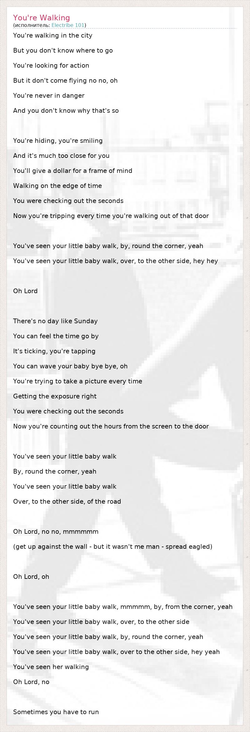 You're walking in the city But you don't know where to go You're looking for action But it don't come flying no no, oh You're never in danger And you don't know why that's so You're hiding, you're smiling And it's much too close for you You'll give a dollar for a frame of mind Walking on the edge of time You were checking out the seconds Now you're tripping every time you're walking out of that door You've seen your little baby walk, by, round the corner, yeah You've seen your little baby walk, over, to the other side, hey hey Oh Lord There's no day like Sunday You can feel the time go by It's ticking, you're tapping You can wave your baby bye bye, oh You're trying to take a picture every time Getting the exposure right You were checking out the seconds Now you're counting out the hours from the screen to the door You've seen your little baby walk By, round the corner, yeah You've seen your little baby walk Over, to the other side, of the road Oh Lord, no no, mmmmmm (get up against the wall - but it wasn't me man - spread eagled) Oh Lord, oh You've seen your little baby walk, mmmmm, by, from the corner, yeah You've seen your little baby walk, over, to the other side You've seen your little baby walk, by, round the corner, yeah You've seen your little baby walk, over to the other side, hey yeah You've seen her walking Oh Lord, no Sometimes you have to run