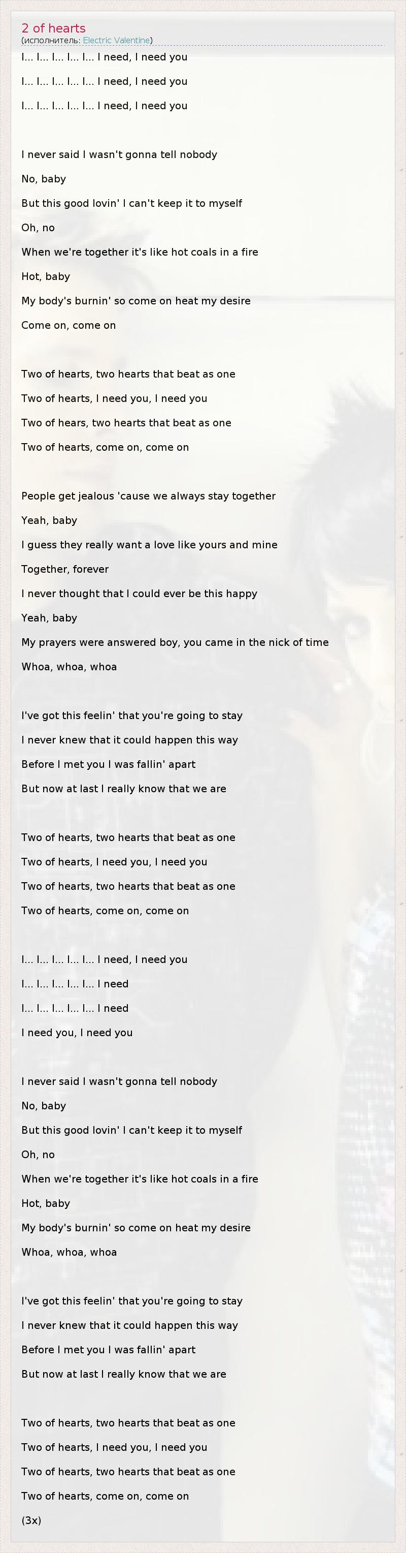 I... I... I... I... I... I need, I need you I... I... I... I... I... I need, I need you I... I... I... I... I... I need, I need you I never said I wasn't gonna tell nobody No, baby But this good lovin' I can't keep it to myself Oh, no When we're together it's like hot coals in a fire Hot, baby My body's burnin' so come on heat my desire Come on, come on Two of hearts, two hearts that beat as one Two of hearts, I need you, I need you Two of hears, two hearts that beat as one Two of hearts, come on, come on People get jealous 'cause we always stay together Yeah, baby I guess they really want a love like yours and mine Together, forever I never thought that I could ever be this happy Yeah, baby My prayers were answered boy, you came in the nick of time Whoa, whoa, whoa I've got this feelin' that you're going to stay I never knew that it could happen this way Before I met you I was fallin' apart But now at last I really know that we are Two of hearts, two hearts that beat as one Two of hearts, I need you, I need you Two of hearts, two hearts that beat as one Two of hearts, come on, come on I... I... I... I... I... I need, I need you I... I... I... I... I... I need I... I... I... I... I... I need I need you, I need you I never said I wasn't gonna tell nobody No, baby But this good lovin' I can't keep it to myself Oh, no When we're together it's like hot coals in a fire Hot, baby My body's burnin' so come on heat my desire Whoa, whoa, whoa I've got this feelin' that you're going to stay I never knew that it could happen this way Before I met you I was fallin' apart But now at last I really know that we are Two of hearts, two hearts that beat as one Two of hearts, I need you, I need you Two of hearts, two hearts that beat as one Two of hearts, come on, come on (3x)