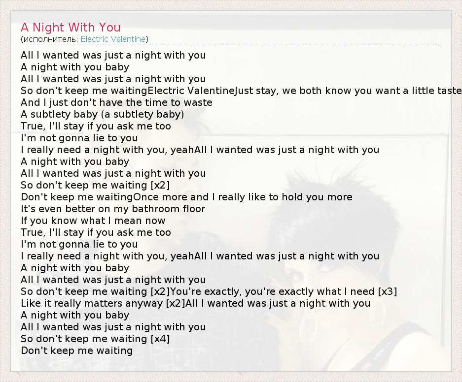 All I wanted was just a night with you A night with you baby All I wanted was just a night with you So don't keep me waitingElectric ValentineJust stay, we both know you want a little taste And I just don't have the time to waste A subtlety baby (a subtlety baby) True, I'll stay if you ask me too I'm not gonna lie to you I really need a night with you, yeahAll I wanted was just a night with you A night with you baby All I wanted was just a night with you So don't keep me waiting [x2] Don't keep me waitingOnce more and I really like to hold you more It's even better on my bathroom floor If you know what I mean now True, I'll stay if you ask me too I'm not gonna lie to you I really need a night with you, yeahAll I wanted was just a night with you A night with you baby All I wanted was just a night with you So don't keep me waiting [x2]You're exactly, you're exactly what I need [x3] Like it really matters anyway [x2]All I wanted was just a night with you A night with you baby All I wanted was just a night with you So don't keep me waiting [x4] Don't keep me waiting