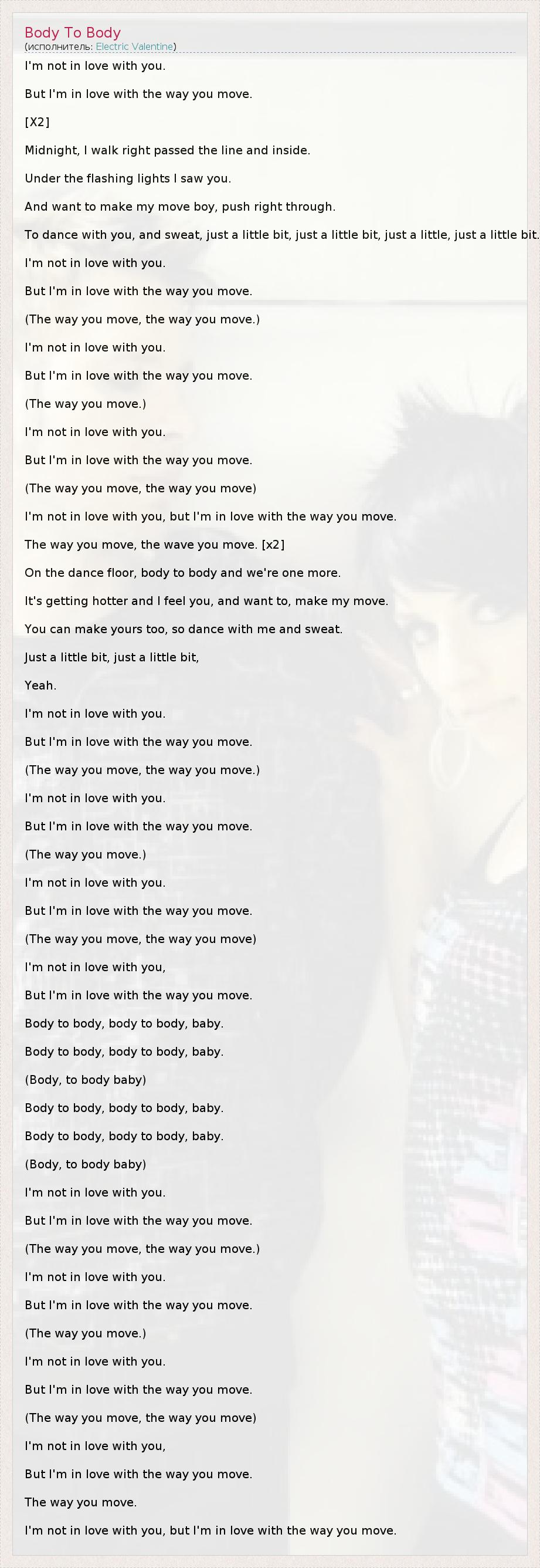 I'm not in love with you. But I'm in love with the way you move. [X2] Midnight, I walk right passed the line and inside. Under the flashing lights I saw you. And want to make my move boy, push right through. To dance with you, and sweat, just a little bit, just a little bit, just a little, just a little bit. I'm not in love with you. But I'm in love with the way you move. (The way you move, the way you move.) I'm not in love with you. But I'm in love with the way you move. (The way you move.) I'm not in love with you. But I'm in love with the way you move. (The way you move, the way you move) I'm not in love with you, but I'm in love with the way you move. The way you move, the wave you move. [x2] On the dance floor, body to body and we're one more. It's getting hotter and I feel you, and want to, make my move. You can make yours too, so dance with me and sweat. Just a little bit, just a little bit, Yeah. I'm not in love with you. But I'm in love with the way you move. (The way you move, the way you move.) I'm not in love with you. But I'm in love with the way you move. (The way you move.) I'm not in love with you. But I'm in love with the way you move. (The way you move, the way you move) I'm not in love with you, But I'm in love with the way you move. Body to body, body to body, baby. Body to body, body to body, baby. (Body, to body baby) Body to body, body to body, baby. Body to body, body to body, baby. (Body, to body baby) I'm not in love with you. But I'm in love with the way you move. (The way you move, the way you move.) I'm not in love with you. But I'm in love with the way you move. (The way you move.) I'm not in love with you. But I'm in love with the way you move. (The way you move, the way you move) I'm not in love with you, But I'm in love with the way you move. The way you move. I'm not in love with you, but I'm in love with the way you move.