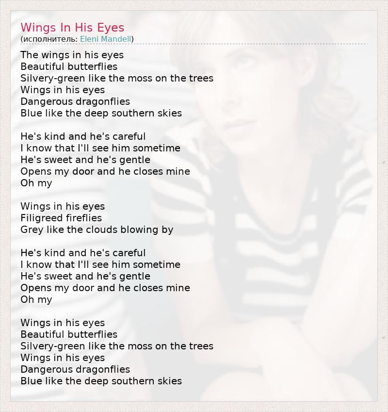 The wings in his eyes Beautiful butterflies Silvery-green like the moss on the trees Wings in his eyes Dangerous dragonflies Blue like the deep southern skies He's kind and he's careful I know that I'll see him sometime He's sweet and he's gentle Opens my door and he closes mine Oh my Wings in his eyes Filigreed fireflies Grey like the clouds blowing by He's kind and he's careful I know that I'll see him sometime He's sweet and he's gentle Opens my door and he closes mine Oh my Wings in his eyes Beautiful butterflies Silvery-green like the moss on the trees Wings in his eyes Dangerous dragonflies Blue like the deep southern skies