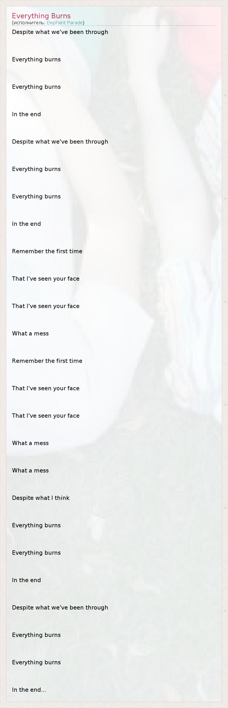 Despite what we've been through Everything burns Everything burns In the end Despite what we've been through Everything burns Everything burns In the end Remember the first time That I've seen your face That I've seen your face What a mess Remember the first time That I've seen your face That I've seen your face What a mess What a mess Despite what I think Everything burns Everything burns In the end Despite what we've been through Everything burns Everything burns In the end...