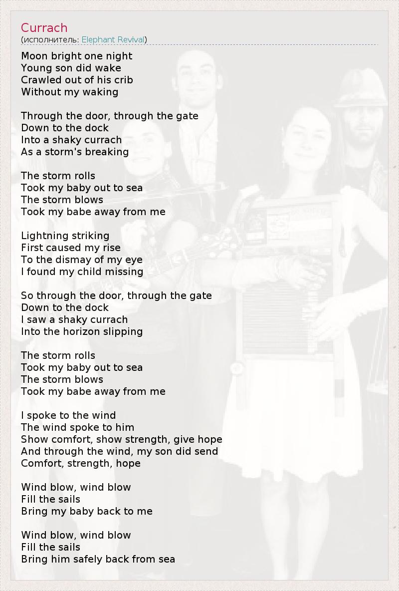 Moon bright one night Young son did wake Crawled out of his crib Without my waking Through the door, through the gate Down to the dock Into a shaky currach As a storm's breaking The storm rolls Took my baby out to sea The storm blows Took my babe away from me Lightning striking First caused my rise To the dismay of my eye I found my child missing So through the door, through the gate Down to the dock I saw a shaky currach Into the horizon slipping The storm rolls Took my baby out to sea The storm blows Took my babe away from me I spoke to the wind The wind spoke to him Show comfort, show strength, give hope And through the wind, my son did send Comfort, strength, hope Wind blow, wind blow Fill the sails Bring my baby back to me Wind blow, wind blow Fill the sails Bring him safely back from sea