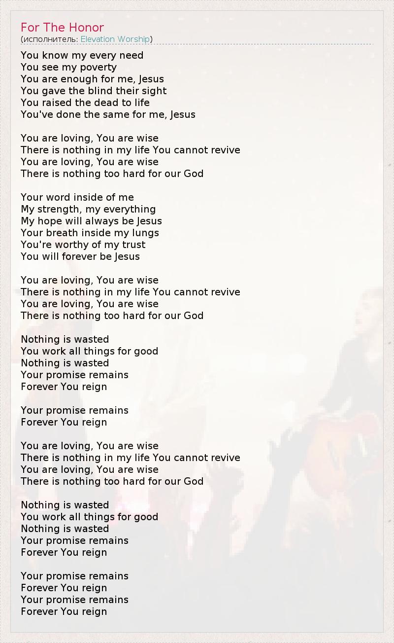 You know my every need You see my poverty You are enough for me, Jesus You gave the blind their sight You raised the dead to life You've done the same for me, Jesus You are loving, You are wise There is nothing in my life You cannot revive You are loving, You are wise There is nothing too hard for our God Your word inside of me My strength, my everything My hope will always be Jesus Your breath inside my lungs You're worthy of my trust You will forever be Jesus You are loving, You are wise There is nothing in my life You cannot revive You are loving, You are wise There is nothing too hard for our God Nothing is wasted You work all things for good Nothing is wasted Your promise remains Forever You reign Your promise remains Forever You reign You are loving, You are wise There is nothing in my life You cannot revive You are loving, You are wise There is nothing too hard for our God Nothing is wasted You work all things for good Nothing is wasted Your promise remains Forever You reign Your promise remains Forever You reign Your promise remains Forever You reign