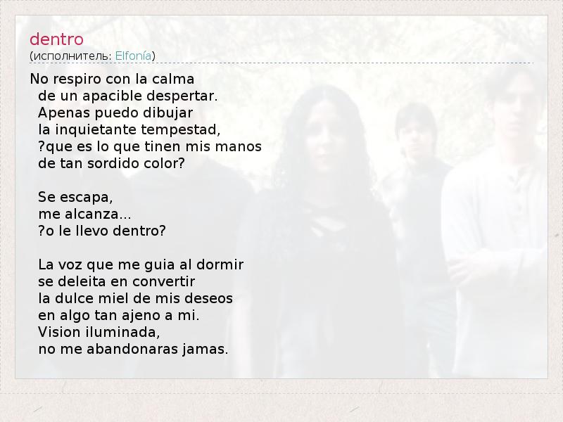 Это интересно:Elfonía — мексиканский art- и progressive-rock-коллектив под управлением вокалистки Stream of Passion Марселы Бовио (Marcela Bovio).Marcela Bovio - вокал, скрипкаAlejandro Millán - гитара, клавишныеRoberto Quintanilla - гитараPablo González - бас-гитараJavier Garagarza - ударныеДискография:Elfonía, 2003 This Sonic Landscape, 2005