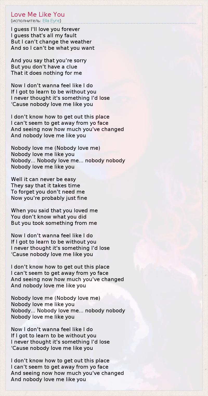 I guess I'll love you forever I guess that's all my fault But I can't change the weather And so I can't be what you want And you say that you're sorry But you don't have a clue That it does nothing for me Now I don't wanna feel like I do If I got to learn to be without you I never thought it's something I'd lose ‘Cause nobody love me like you I don't know how to get out this place I can't seem to get away from yo face And seeing now how much you've changed And nobody love me like you Nobody love me (Nobody love me) Nobody love me like you Nobody... Nobody love me... nobody nobody Nobody love me like you Well it can never be easy They say that it takes time To forget you don't need me Now you're probably just fine When you said that you loved me You don't know what you did But you took something from me Now I don't wanna feel like I do If I got to learn to be without you I never thought it's something I'd lose ‘Cause nobody love me like you I don't know how to get out this place I can't seem to get away from yo face And seeing now how much you've changed And nobody love me like you Nobody love me (Nobody love me) Nobody love me like you Nobody... Nobody love me... nobody nobody Nobody love me like you Now I don't wanna feel like I do If I got to learn to be without you I never thought it's something I'd lose ‘Cause nobody love me like you I don't know how to get out this place I can't seem to get away from yo face And seeing now how much you've changed And nobody love me like you