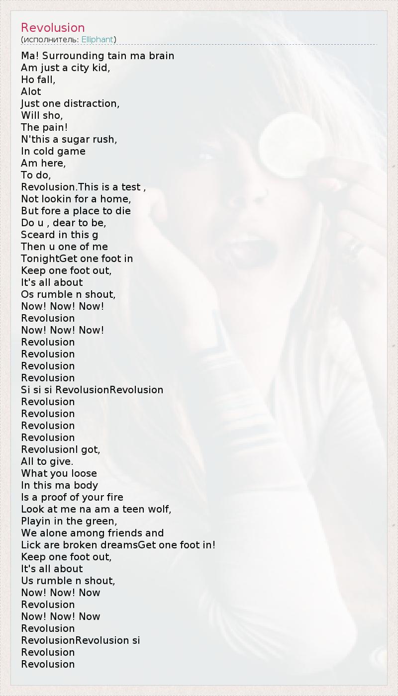 Ma! Surrounding tain ma brain Am just a city kid, Ho fall, Alot Just one distraction, Will sho, The pain! N'this a sugar rush, In cold game Am here, To do, Revolusion.This is a test , Not lookin for a home, But fore a place to die Do u , dear to be, Sceard in this g Then u one of me TonightGet one foot in Keep one foot out, It's all about Os rumble n shout, Now! Now! Now! Revolusion Now! Now! Now! Revolusion Revolusion Revolusion Revolusion Si si si RevolusionRevolusion Revolusion Revolusion Revolusion Revolusion RevolusionI got, All to give. What you loose In this ma body Is a proof of your fire Look at me na am a teen wolf, Playin in the green, We alone among friends and Lick are broken dreamsGet one foot in! Keep one foot out, It's all about Us rumble n shout, Now! Now! Now Revolusion Now! Now! Now Revolusion RevolusionRevolusion si Revolusion Revolusion