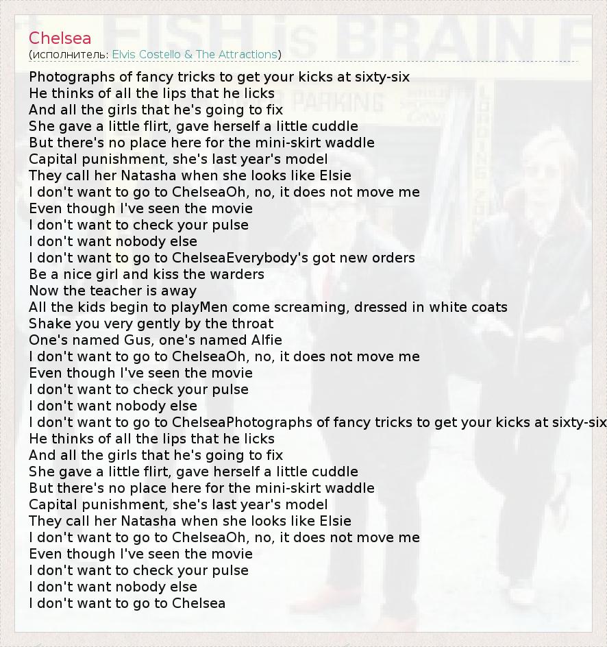 Photographs of fancy tricks to get your kicks at sixty-six He thinks of all the lips that he licks And all the girls that he's going to fix She gave a little flirt, gave herself a little cuddle But there's no place here for the mini-skirt waddle Capital punishment, she's last year's model They call her Natasha when she looks like Elsie I don't want to go to ChelseaOh, no, it does not move me Even though I've seen the movie I don't want to check your pulse I don't want nobody else I don't want to go to ChelseaEverybody's got new orders Be a nice girl and kiss the warders Now the teacher is away All the kids begin to playMen come screaming, dressed in white coats Shake you very gently by the throat One's named Gus, one's named Alfie I don't want to go to ChelseaOh, no, it does not move me Even though I've seen the movie I don't want to check your pulse I don't want nobody else I don't want to go to ChelseaPhotographs of fancy tricks to get your kicks at sixty-six He thinks of all the lips that he licks And all the girls that he's going to fix She gave a little flirt, gave herself a little cuddle But there's no place here for the mini-skirt waddle Capital punishment, she's last year's model They call her Natasha when she looks like Elsie I don't want to go to ChelseaOh, no, it does not move me Even though I've seen the movie I don't want to check your pulse I don't want nobody else I don't want to go to Chelsea