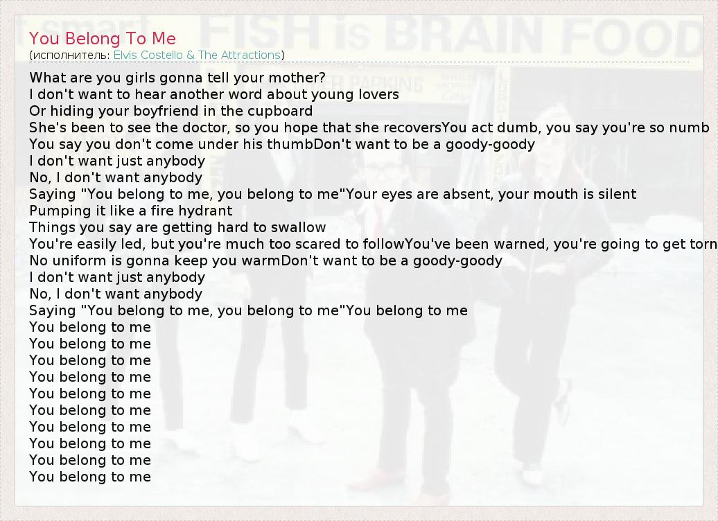 What are you girls gonna tell your mother? I don't want to hear another word about young lovers Or hiding your boyfriend in the cupboard She's been to see the doctor, so you hope that she recoversYou act dumb, you say you're so numb You say you don't come under his thumbDon't want to be a goody-goody I don't want just anybody No, I don't want anybody Saying "You belong to me, you belong to me"Your eyes are absent, your mouth is silent Pumping it like a fire hydrant Things you say are getting hard to swallow You're easily led, but you're much too scared to followYou've been warned, you're going to get torn No uniform is gonna keep you warmDon't want to be a goody-goody I don't want just anybody No, I don't want anybody Saying "You belong to me, you belong to me"You belong to me You belong to me You belong to me You belong to me You belong to me You belong to me You belong to me You belong to me You belong to me You belong to me You belong to me