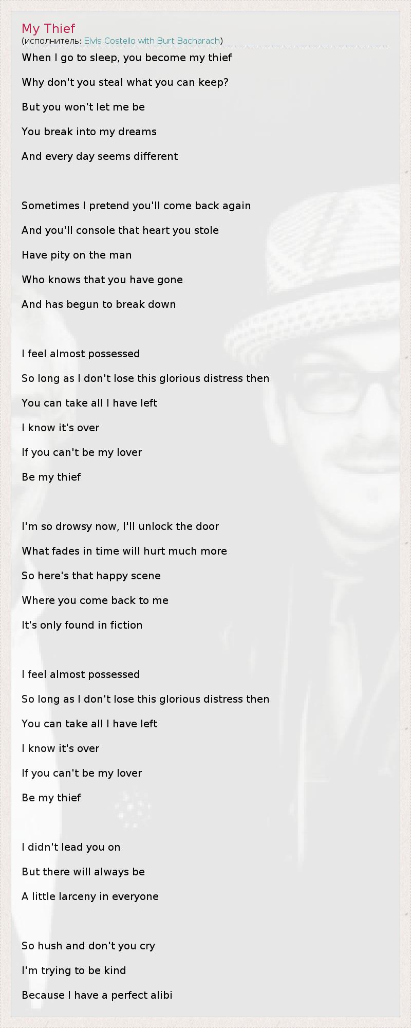 When I go to sleep, you become my thief Why don't you steal what you can keep? But you won't let me be You break into my dreams And every day seems different Sometimes I pretend you'll come back again And you'll console that heart you stole Have pity on the man Who knows that you have gone And has begun to break down I feel almost possessed So long as I don't lose this glorious distress then You can take all I have left I know it's over If you can't be my lover Be my thief I'm so drowsy now, I'll unlock the door What fades in time will hurt much more So here's that happy scene Where you come back to me It's only found in fiction I feel almost possessed So long as I don't lose this glorious distress then You can take all I have left I know it's over If you can't be my lover Be my thief I didn't lead you on But there will always be A little larceny in everyone So hush and don't you cry I'm trying to be kind Because I have a perfect alibi