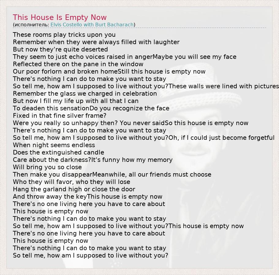 These rooms play tricks upon you Remember when they were always filled with laughter But now they're quite deserted They seem to just echo voices raised in angerMaybe you will see my face Reflected there on the pane in the window Our poor forlorn and broken homeStill this house is empty now There's nothing I can do to make you want to stay So tell me, how am I supposed to live without you?These walls were lined with pictures Remember the glass we charged in celebration But now I fill my life up with all that I can To deaden this sensationDo you recognize the face Fixed in that fine silver frame? Were you really so unhappy then? You never saidSo this house is empty now There's nothing I can do to make you want to stay So tell me, how am I supposed to live without you?Oh, if I could just become forgetful When night seems endless Does the extinguished candle Care about the darkness?It's funny how my memory Will bring you so close Then make you disappearMeanwhile, all our friends must choose Who they will favor, who they will lose Hang the garland high or close the door And throw away the keyThis house is empty now There's no one living here you have to care about This house is empty now There's nothing I can do to make you want to stay So tell me, how am I supposed to live without you?This house is empty now There's no one living here you have to care about This house is empty now There's nothing I can do to make you want to stay So tell me, how am I supposed to live without you?
