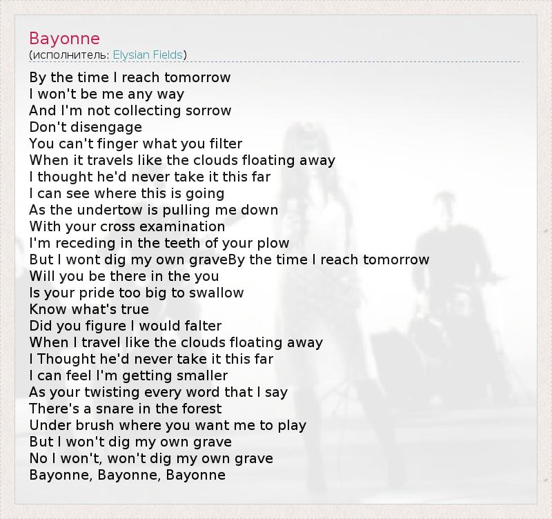 By the time I reach tomorrow I won't be me any way And I'm not collecting sorrow Don't disengage You can't finger what you filter When it travels like the clouds floating away I thought he'd never take it this far I can see where this is going As the undertow is pulling me down With your cross examination I'm receding in the teeth of your plow But I wont dig my own graveBy the time I reach tomorrow Will you be there in the you Is your pride too big to swallow Know what's true Did you figure I would falter When I travel like the clouds floating away I Thought he'd never take it this far I can feel I'm getting smaller As your twisting every word that I say There's a snare in the forest Under brush where you want me to play But I won't dig my own grave No I won't, won't dig my own grave Bayonne, Bayonne, Bayonne