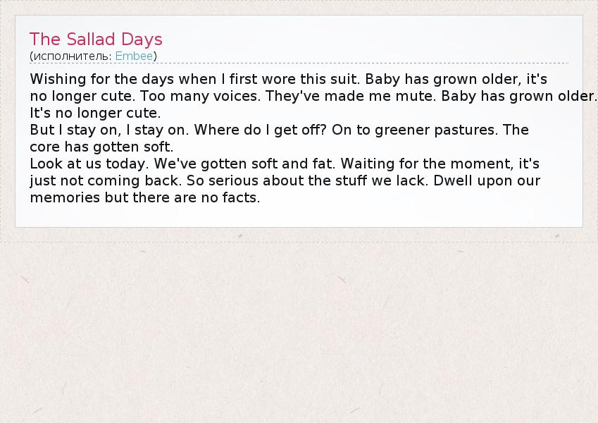А как ты думаешь, о чем песня "The Sallad Days" ?