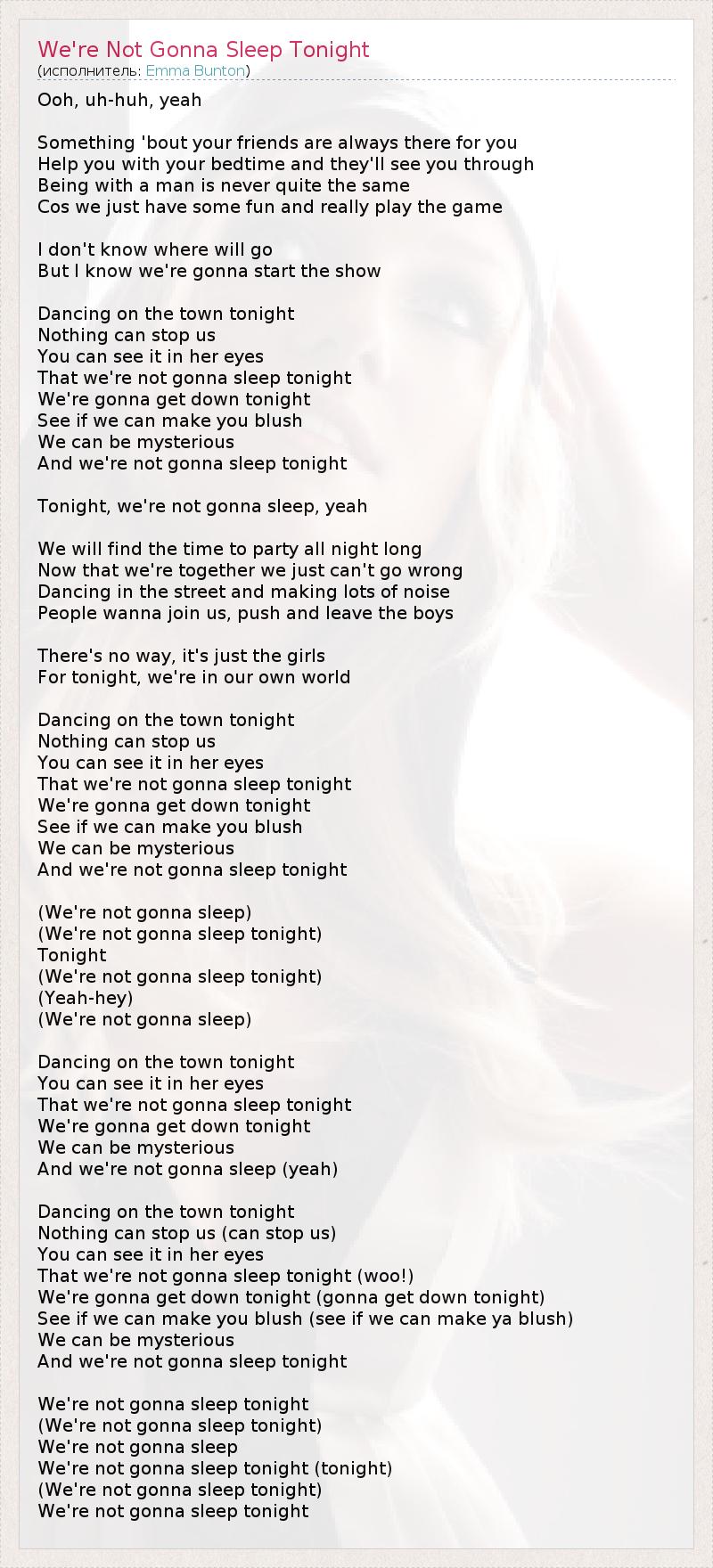 ГлавнаяИсполнителиEmma BuntonWe're Not Gonna Sleep Tonight
