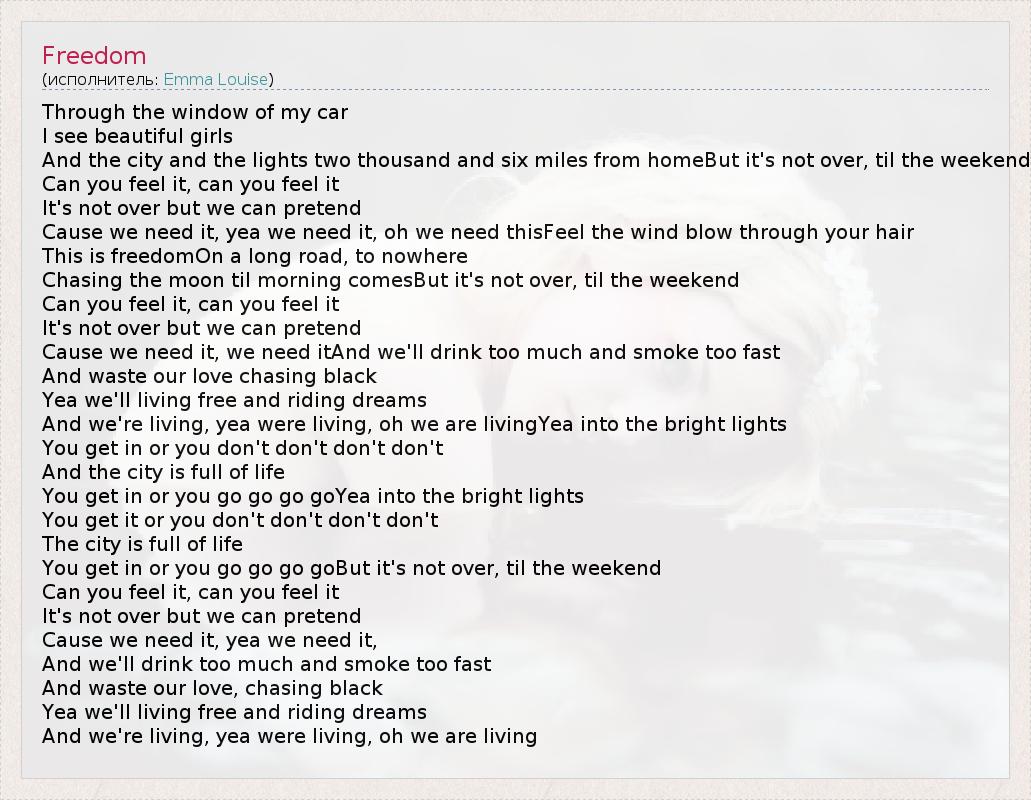Through the window of my car I see beautiful girls And the city and the lights two thousand and six miles from homeBut it's not over, til the weekend Can you feel it, can you feel it It's not over but we can pretend Cause we need it, yea we need it, oh we need thisFeel the wind blow through your hair This is freedomOn a long road, to nowhere Chasing the moon til morning comesBut it's not over, til the weekend Can you feel it, can you feel it It's not over but we can pretend Cause we need it, we need itAnd we'll drink too much and smoke too fast And waste our love chasing black Yea we'll living free and riding dreams And we're living, yea were living, oh we are livingYea into the bright lights You get in or you don't don't don't don't And the city is full of life You get in or you go go go goYea into the bright lights You get it or you don't don't don't don't The city is full of life You get in or you go go go goBut it's not over, til the weekend Can you feel it, can you feel it It's not over but we can pretend Cause we need it, yea we need it, And we'll drink too much and smoke too fast And waste our love, chasing black Yea we'll living free and riding dreams And we're living, yea were living, oh we are living