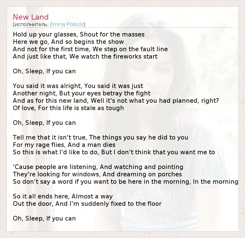 Hold up your glasses, Shout for the masses Here we go, And so begins the show And not for the first time, We step on the fault line And just like that, We watch the fireworks start Oh, Sleep, If you can You said it was alright, You said it was just Another night, But your eyes betray the fight And as for this new land, Well it's not what you had planned, right? Of love, For this life is stale as tough Oh, Sleep, If you can Tell me that it isn't true, The things you say he did to you For my rage flies, And a man dies So this is what I'd like to do, But I don't think that you want me to 'Cause people are listening, And watching and pointing They're looking for windows, And dreaming on porches So don't say a word if you want to be here in the morning, In the morning So it all ends here, Almost a way Out the door, And I'm suddenly fixed to the floor Oh, Sleep, If you can