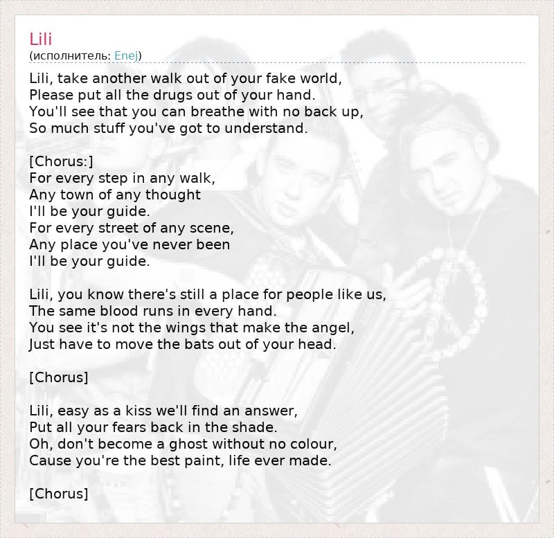 Лили, попробуй ещё раз уйти из своей фальшивой жизни, Пожалуйста, выброси наркотики, которые у тебя в руке. Ты увидишь, что можешь дышать без трубки, Так много всего ты должна понять. [Припев:] Куда бы ты ни пошла, На каждом шагу твоего пути Я буду твоим проводником. На любой улице, В любом месте, где ты никогда не была, Я буду твоим проводником. Лили, знаешь, в этом мире ещё есть место для таких людей, как мы, Та же самая кровь течёт в каждой руке. Видишь, это не крылья делают человека ангелом, Нужно только выбросить дурь из головы. [Припев] Лили, такой же простой, как поцелуй, мы найдём ответ, Оставь все свои страхи. О, не становись бесцветной, как призрак, Потому что ты лучшая краска, которая есть в жизни. [Припев]