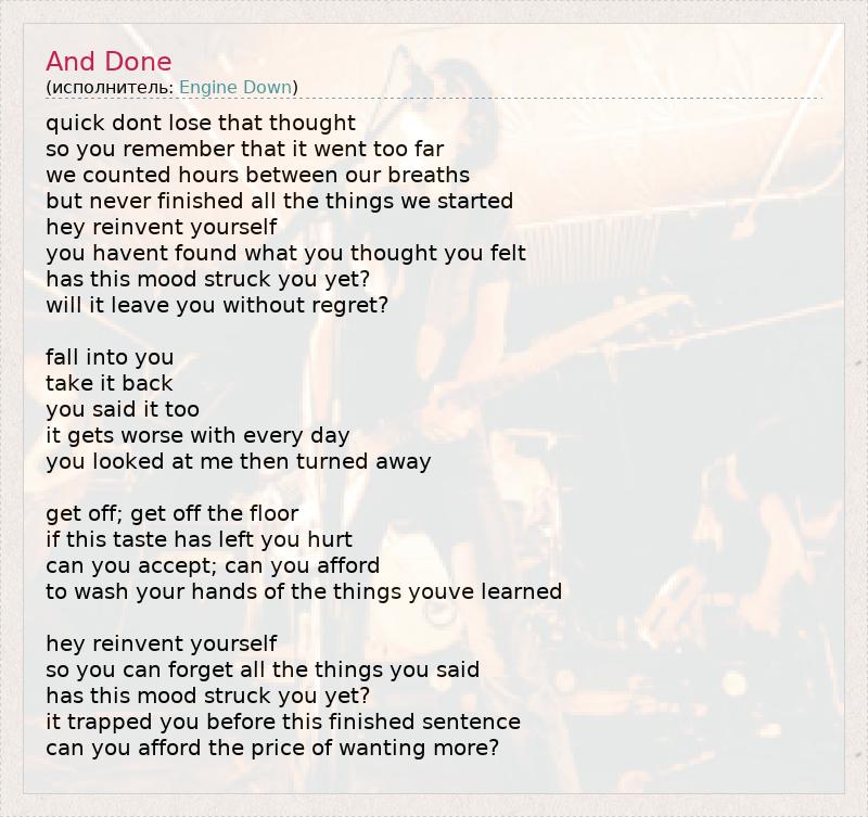 quick dont lose that thought so you remember that it went too far we counted hours between our breaths but never finished all the things we started hey reinvent yourself you havent found what you thought you felt has this mood struck you yet? will it leave you without regret? fall into you take it back you said it too it gets worse with every day you looked at me then turned away get off; get off the floor if this taste has left you hurt can you accept; can you afford to wash your hands of the things youve learned hey reinvent yourself so you can forget all the things you said has this mood struck you yet? it trapped you before this finished sentence can you afford the price of wanting more?