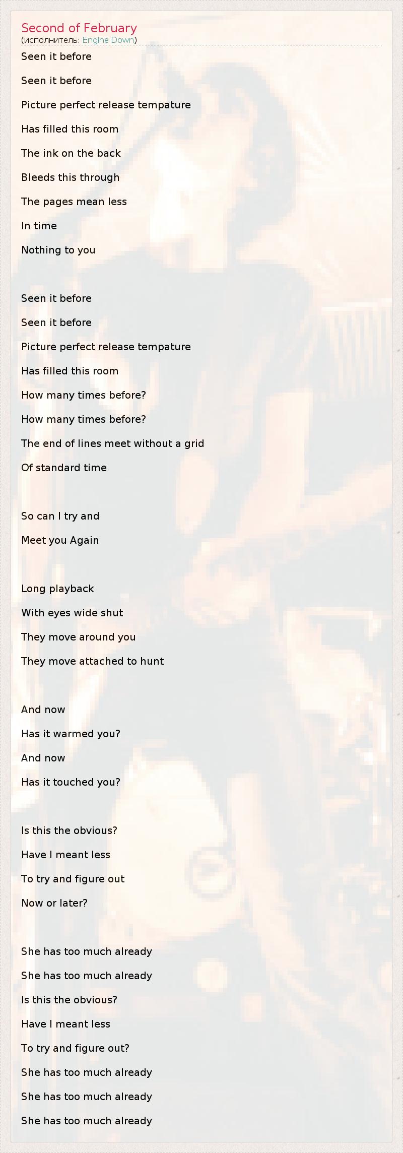 Seen it before Seen it before Picture perfect release tempature Has filled this room The ink on the back Bleeds this through The pages mean less In time Nothing to you Seen it before Seen it before Picture perfect release tempature Has filled this room How many times before? How many times before? The end of lines meet without a grid Of standard time So can I try and Meet you Again Long playback With eyes wide shut They move around you They move attached to hunt And now Has it warmed you? And now Has it touched you? Is this the obvious? Have I meant less To try and figure out Now or later? She has too much already She has too much already Is this the obvious? Have I meant less To try and figure out? She has too much already She has too much already She has too much already