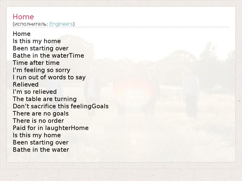 Home Is this my home Been starting over Bathe in the waterTime Time after time I'm feeling so sorry I run out of words to say Relieved I'm so relieved The table are turning Don't sacrifice this feelingGoals There are no goals There is no order Paid for in laughterHome Is this my home Been starting over Bathe in the water