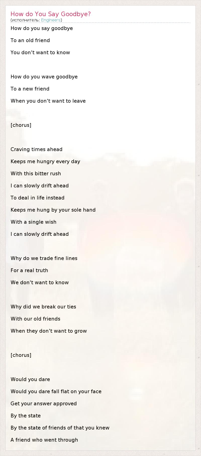 How do you say goodbye To an old friend You don't want to know How do you wave goodbye To a new friend When you don't want to leave [chorus] Craving times ahead Keeps me hungry every day With this bitter rush I can slowly drift ahead To deal in life instead Keeps me hung by your sole hand With a single wish I can slowly drift ahead Why do we trade fine lines For a real truth We don't want to know Why did we break our ties With our old friends When they don't want to grow [chorus] Would you dare Would you dare fall flat on your face Get your answer approved By the state By the state of friends of that you knew A friend who went through